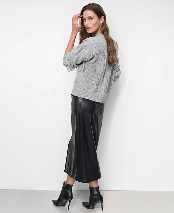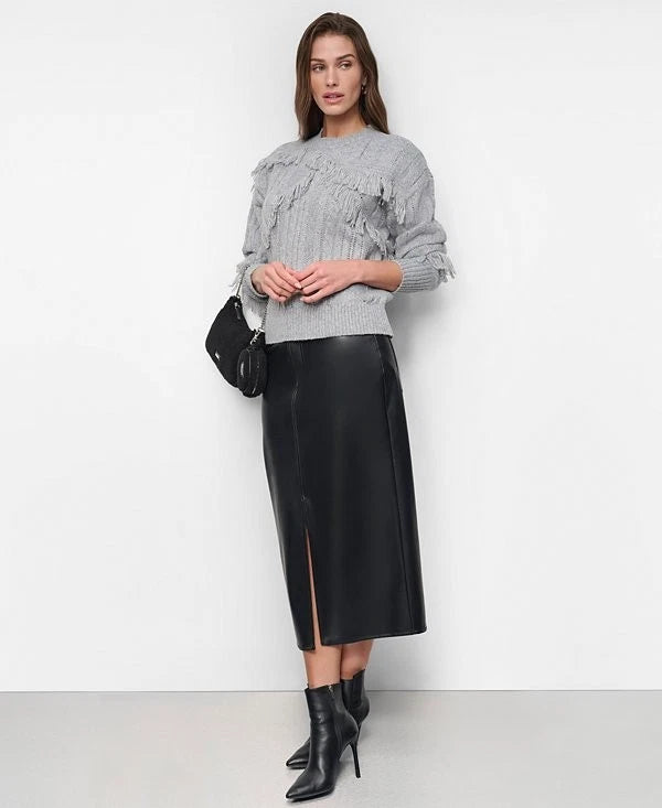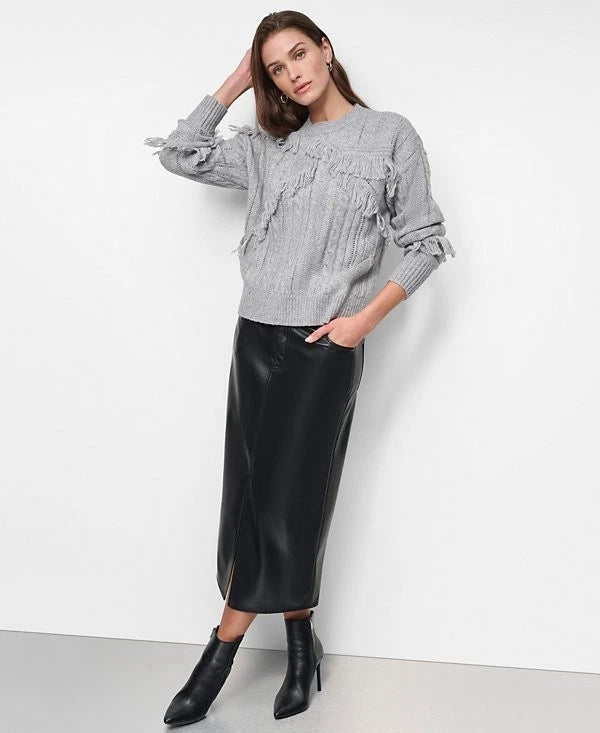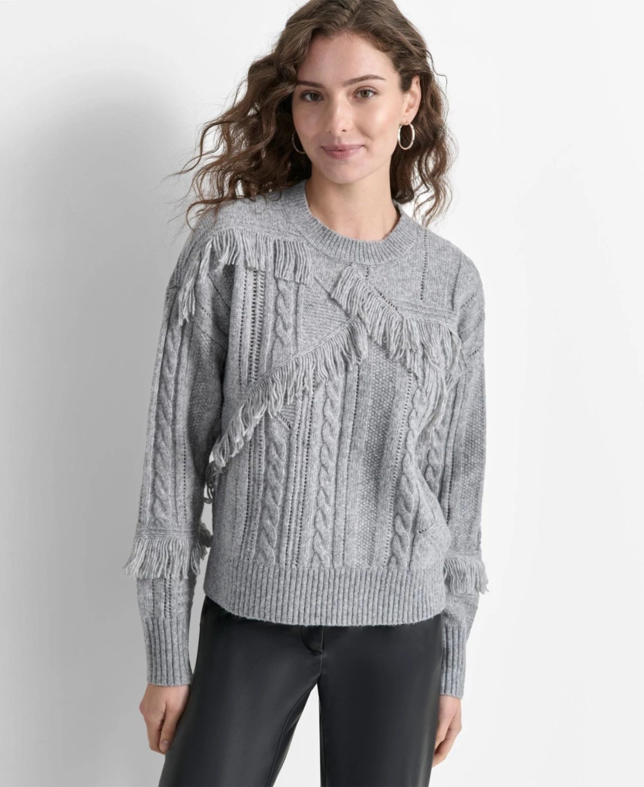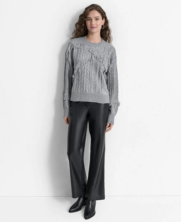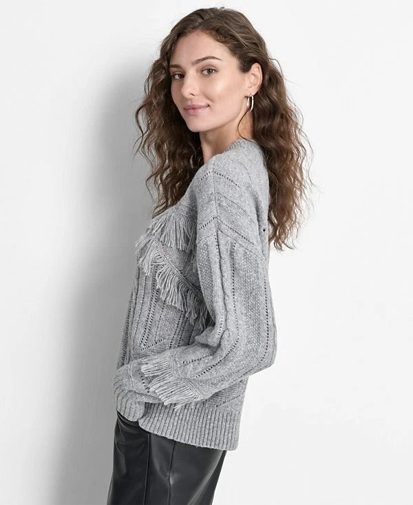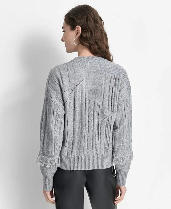 DKNY Women's Fringed Mixed-Stitch Sweater Gray Size L MSRP $109