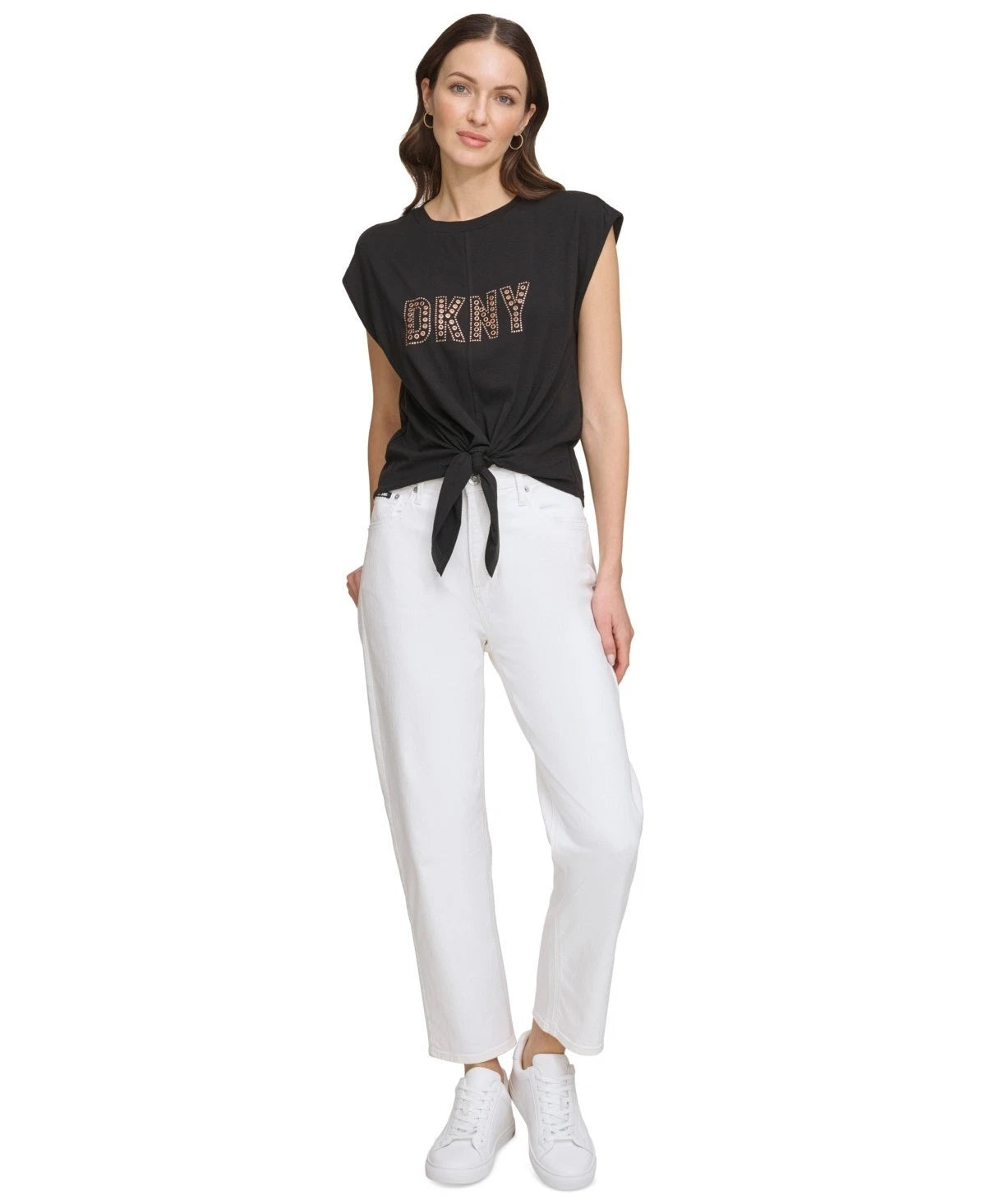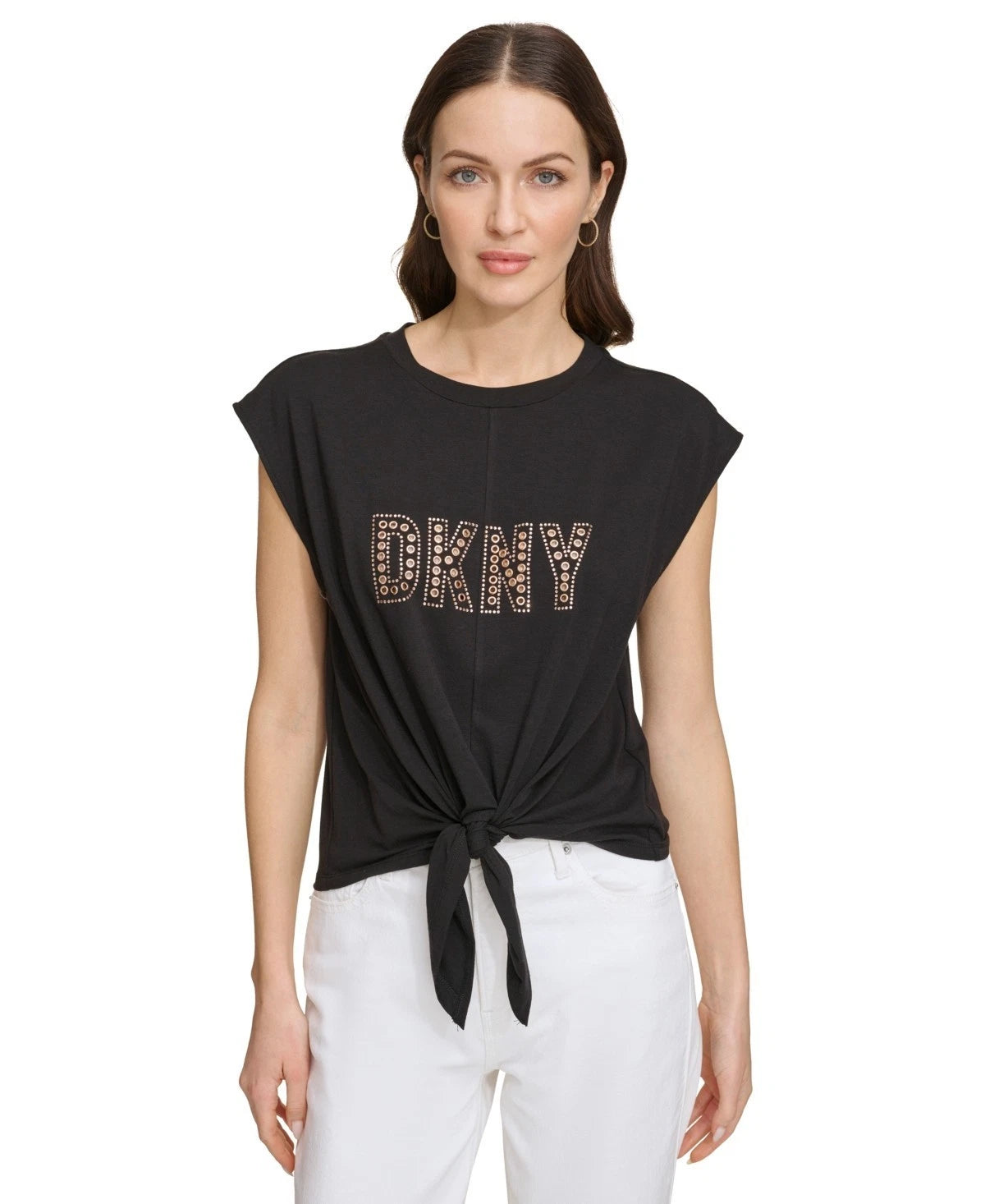 A chic logo embellished with grommets standout on this women's top from DKNY, finished with a charming tie at the hem.