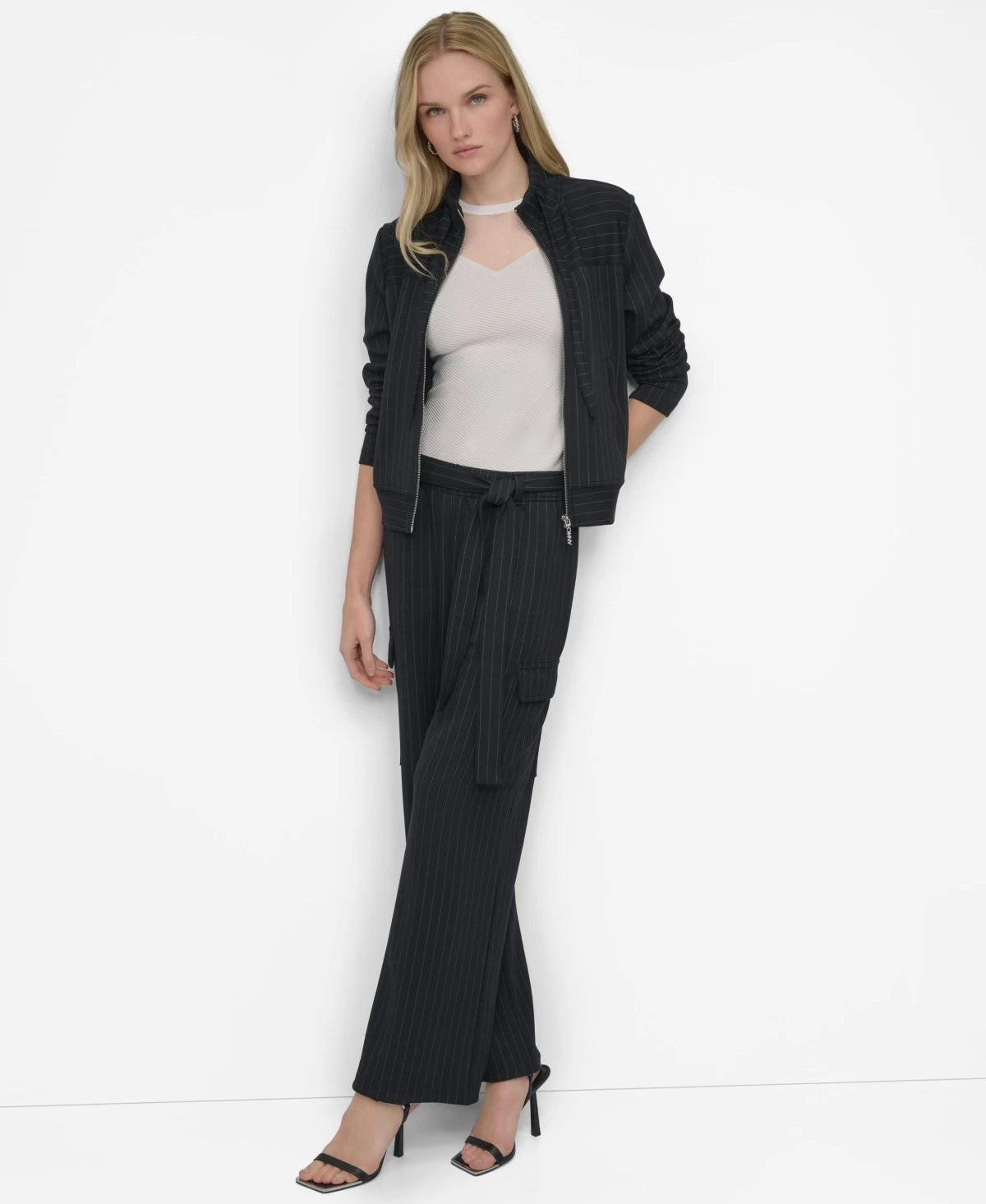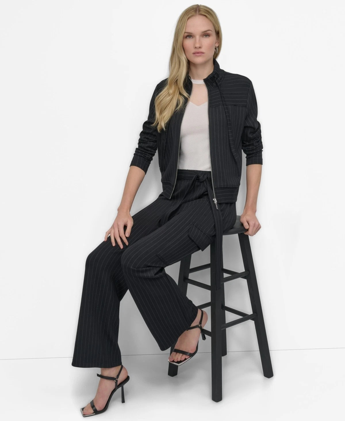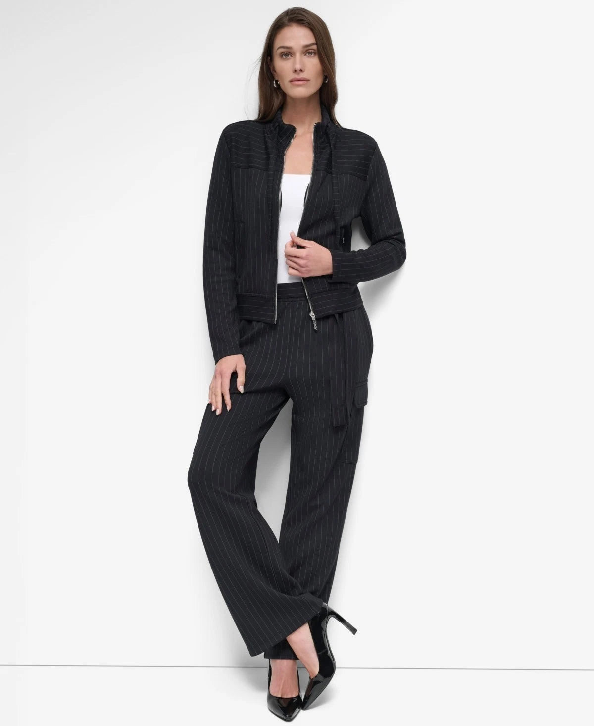 DKNY Women's Pinstripe Zip-Front Stand-Collar Jacket Black Size L MSRP $139