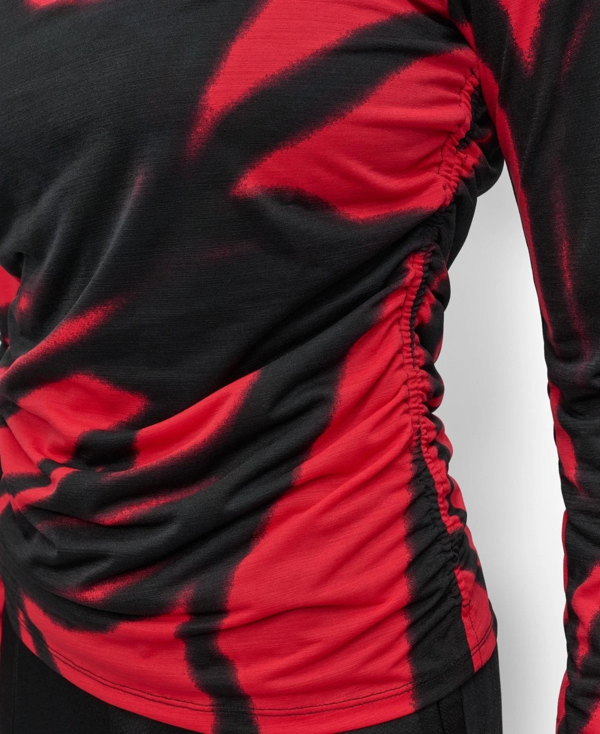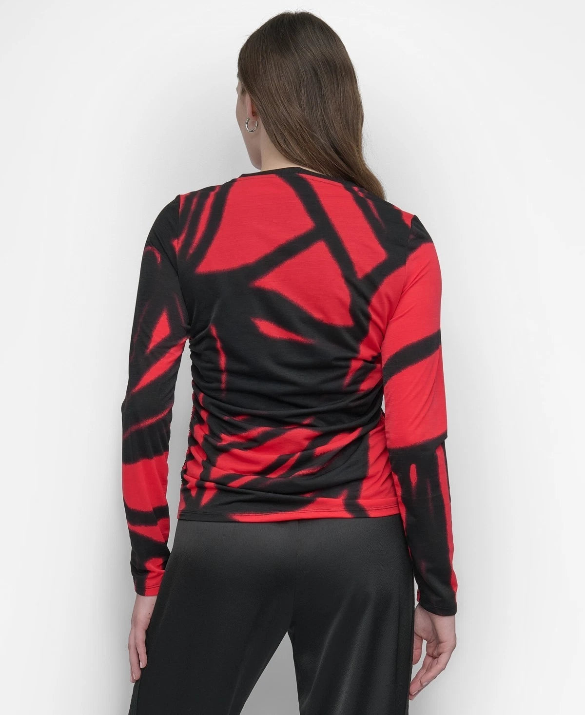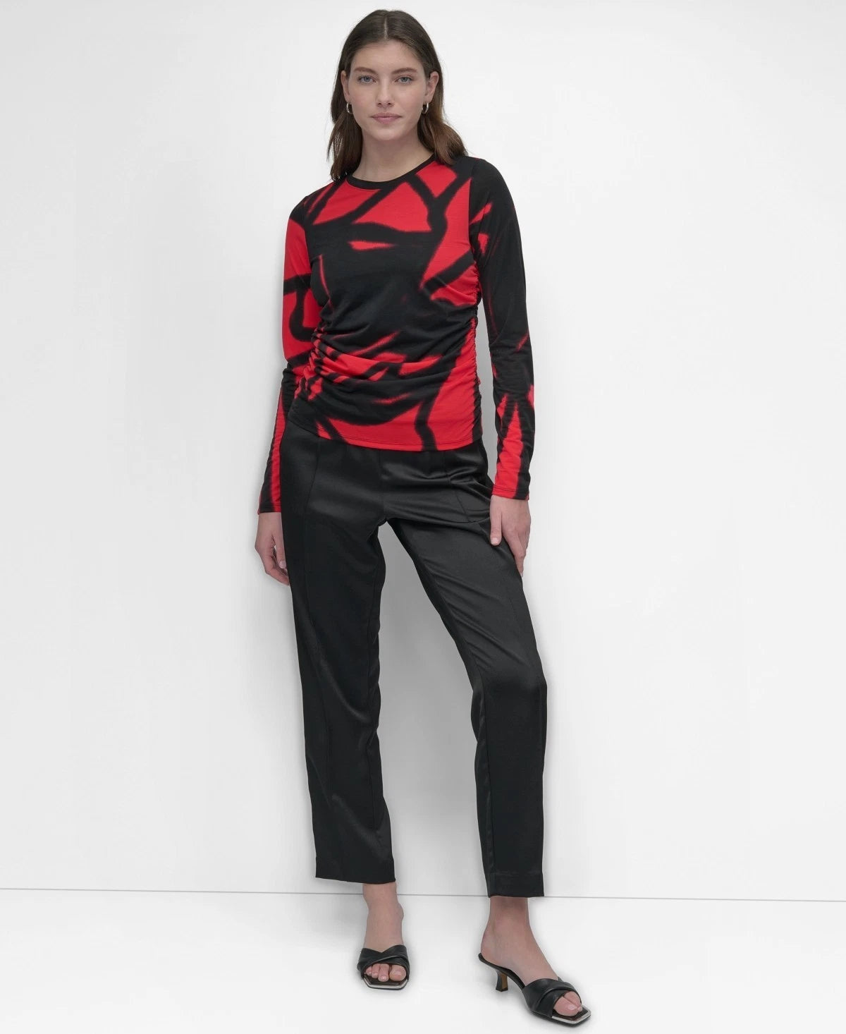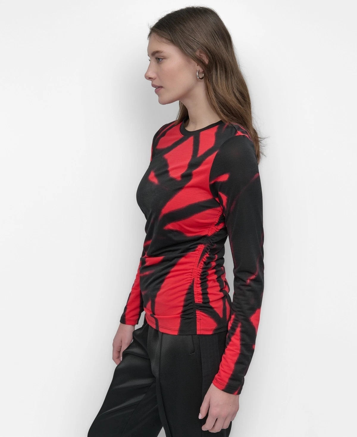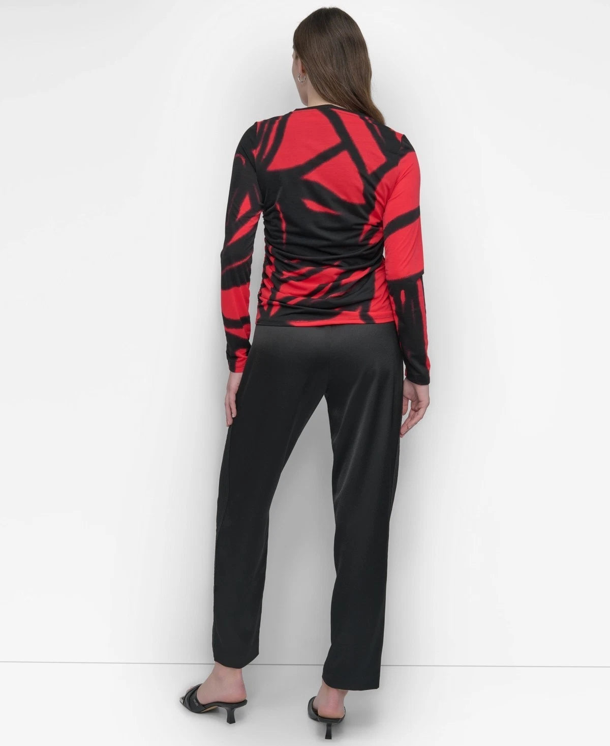 DKNY Women's Printed Crewneck Long-Sleeve Ruched Top Red Black Size XS MSRP $79