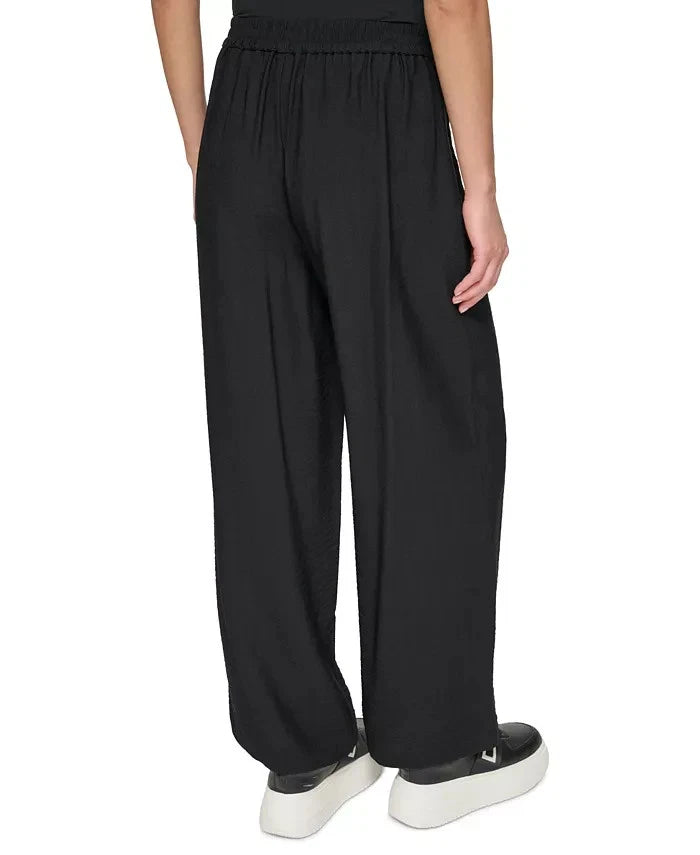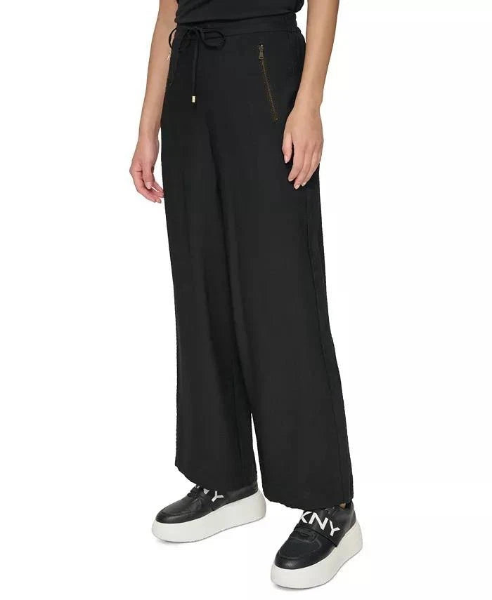 Description: Women's DKNY Drawstring Pants - Black - Straight-leg pants Level up your laid-back look in woven drawstring pants accented with gilded zippers and tie tips.