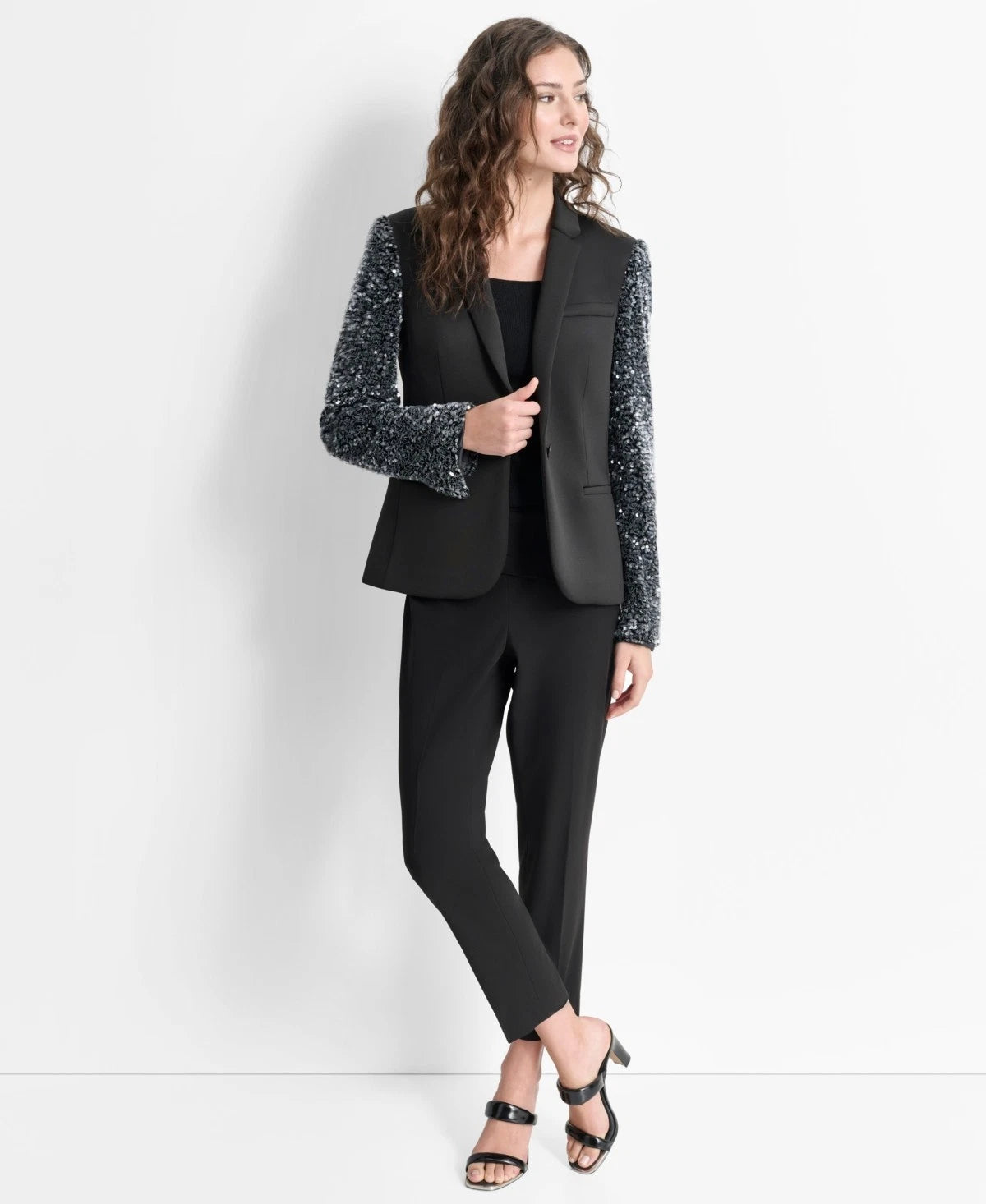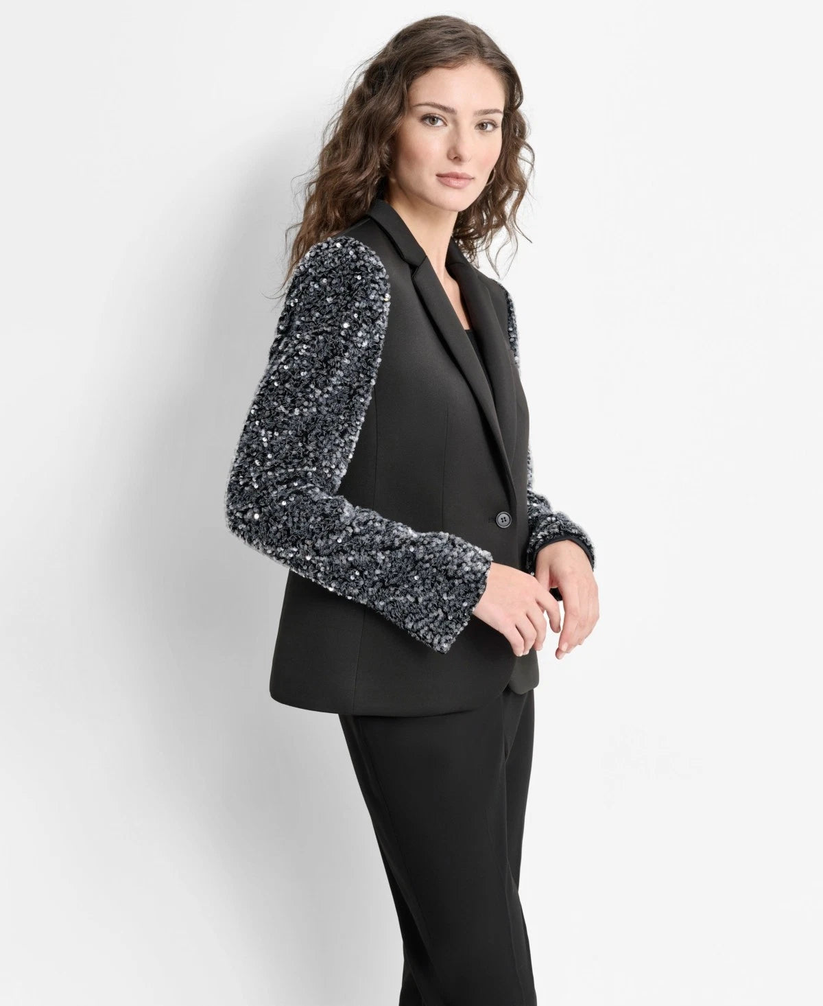 Professional tailoring gets a fun twist on this DKNY blazer, framed with sequinned sleeves that are ready to go from work to play.