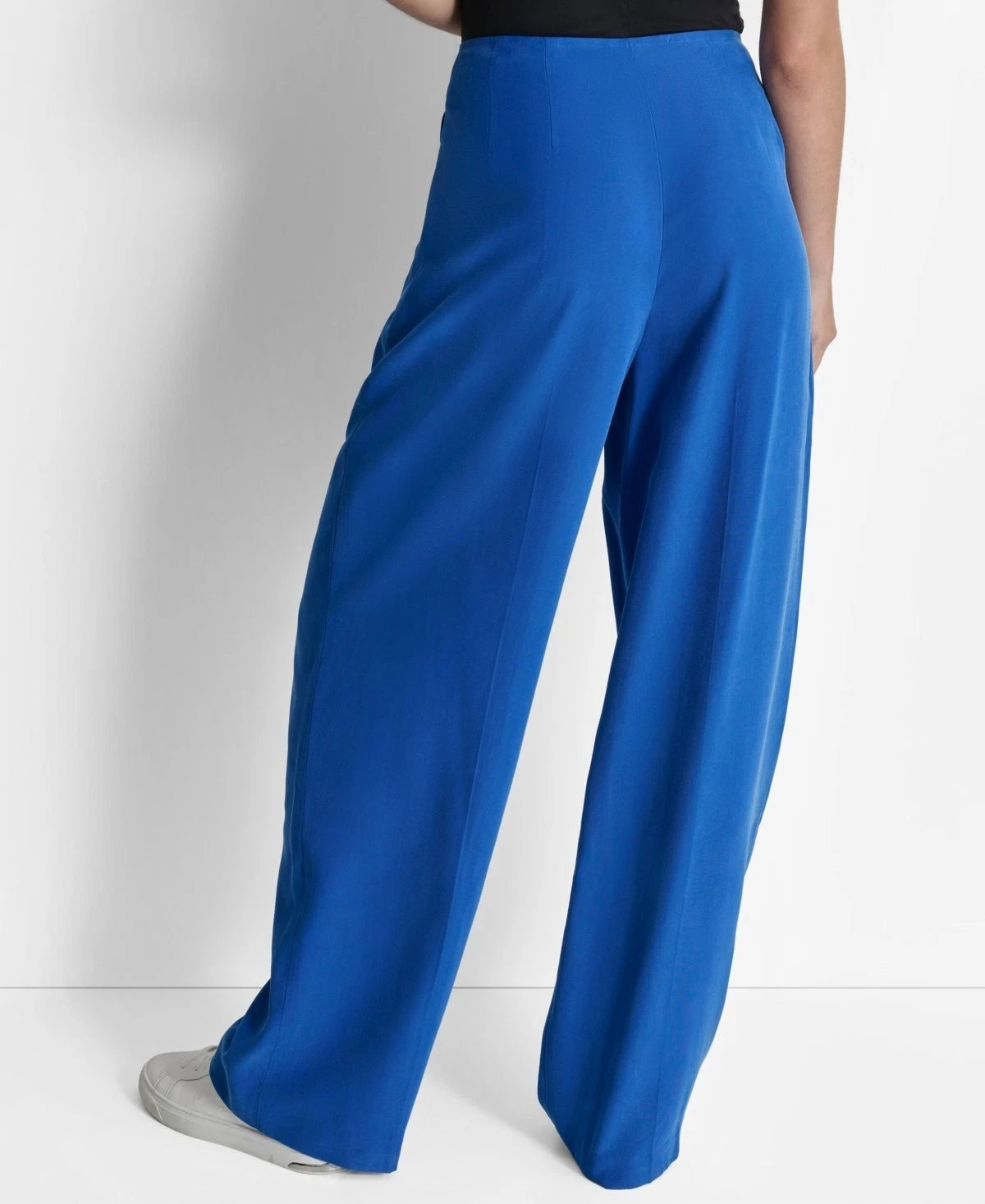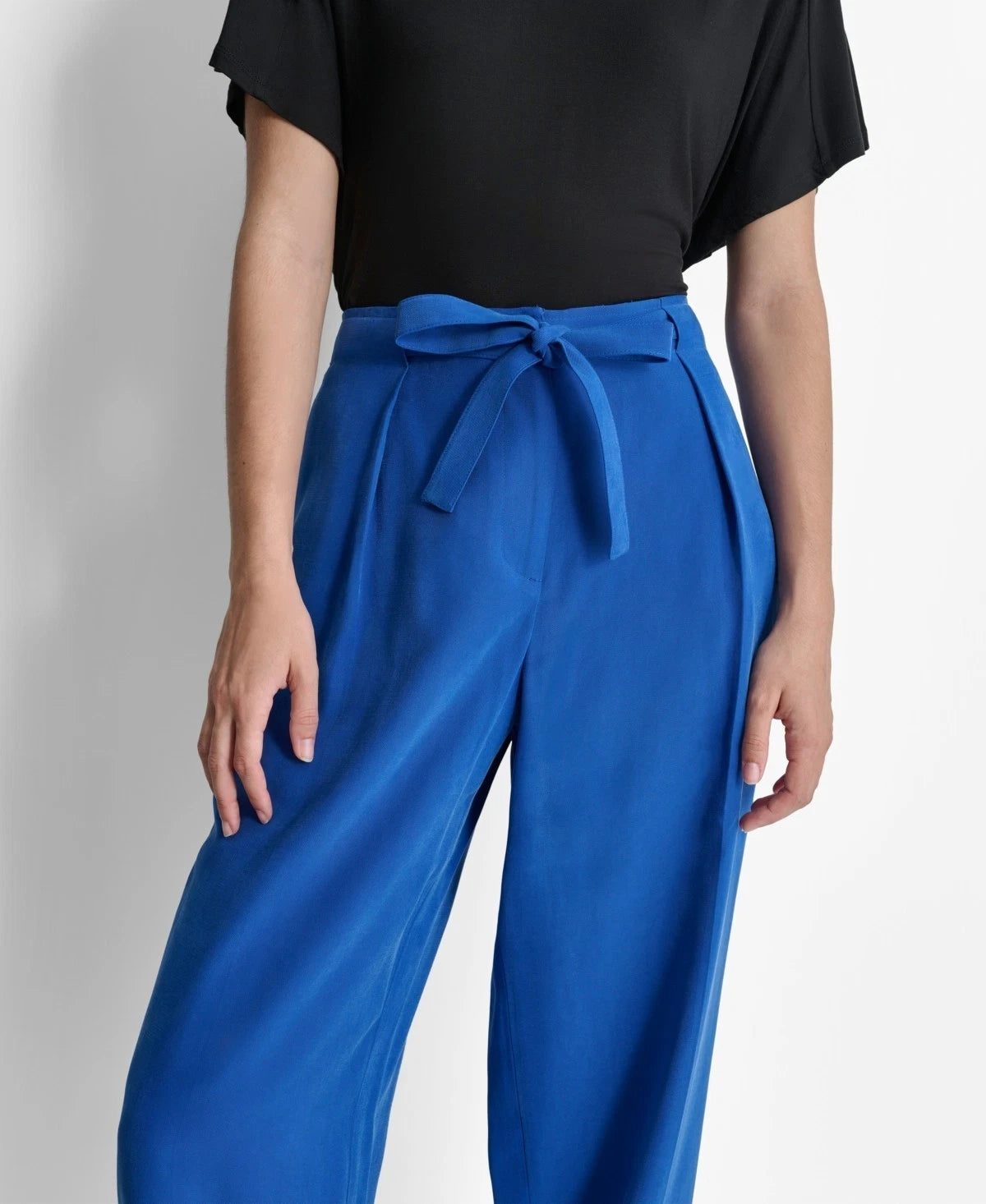 Waistline pleating and a soft tie smartly top off the wide-leg design of these frosted twill pants from DKNY.