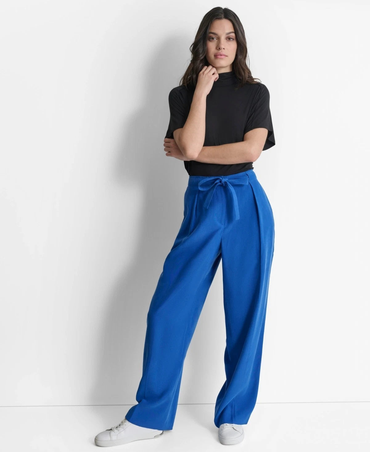 Waistline pleating and a soft tie smartly top off the wide-leg design of these frosted twill pants from DKNY.