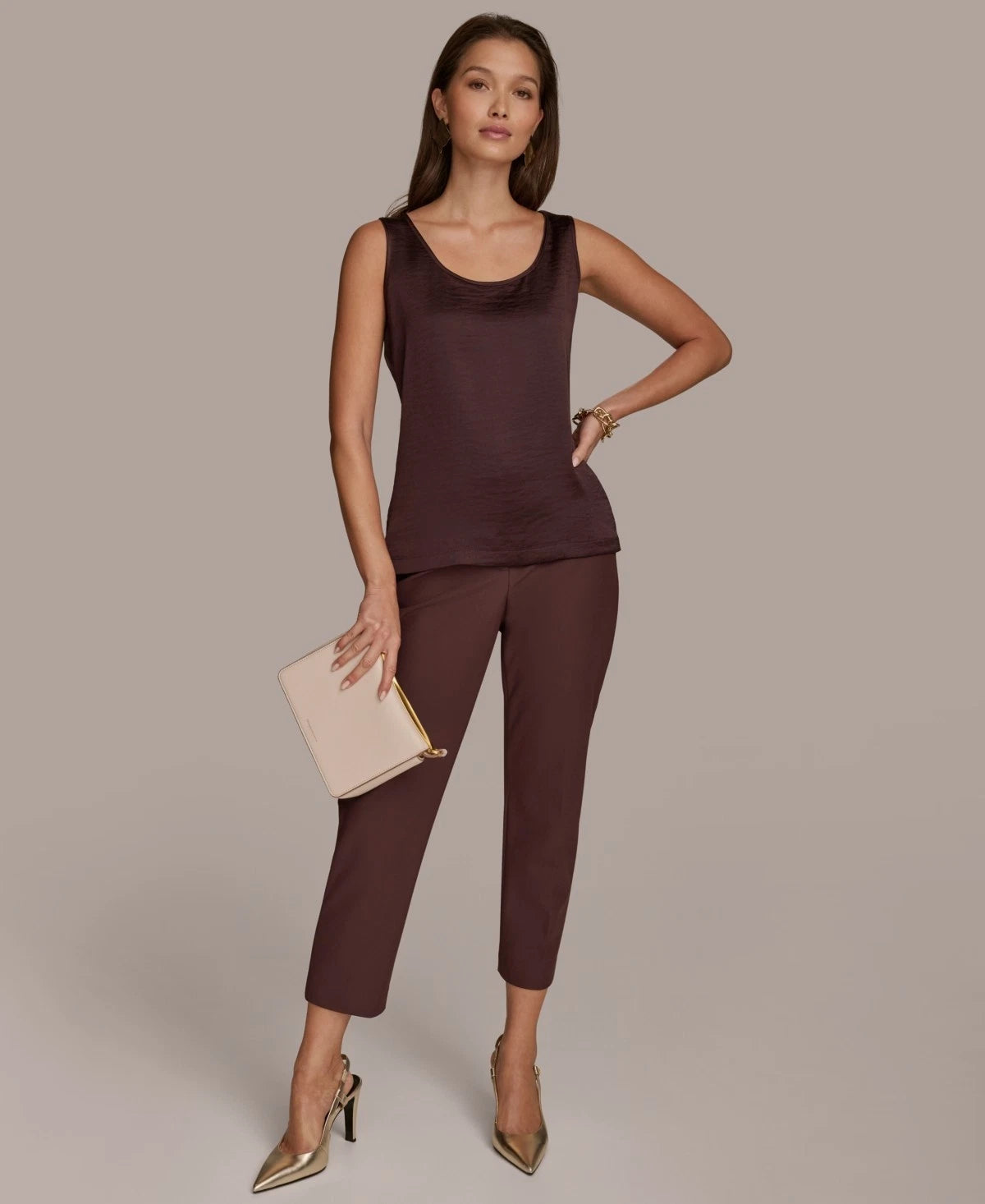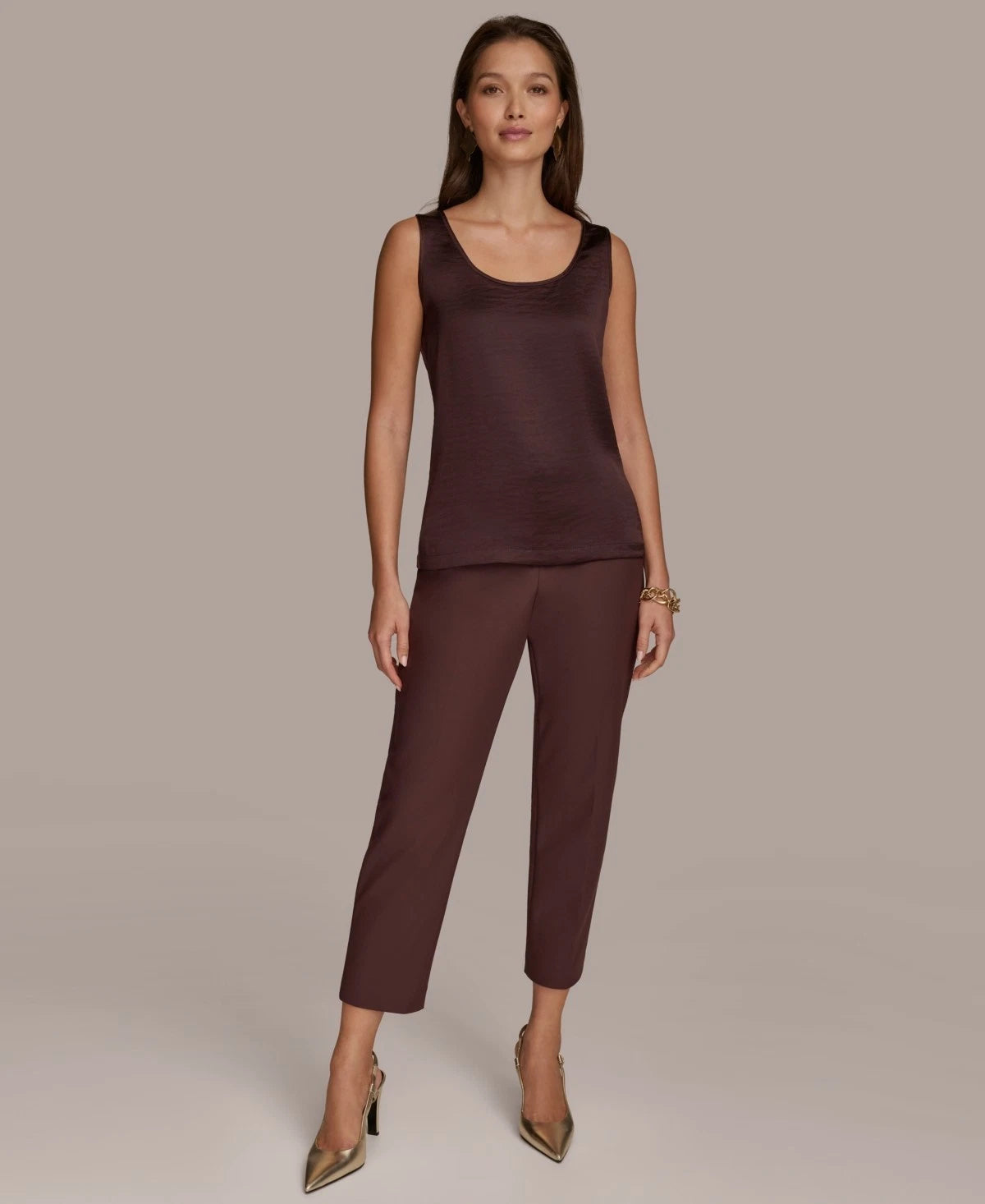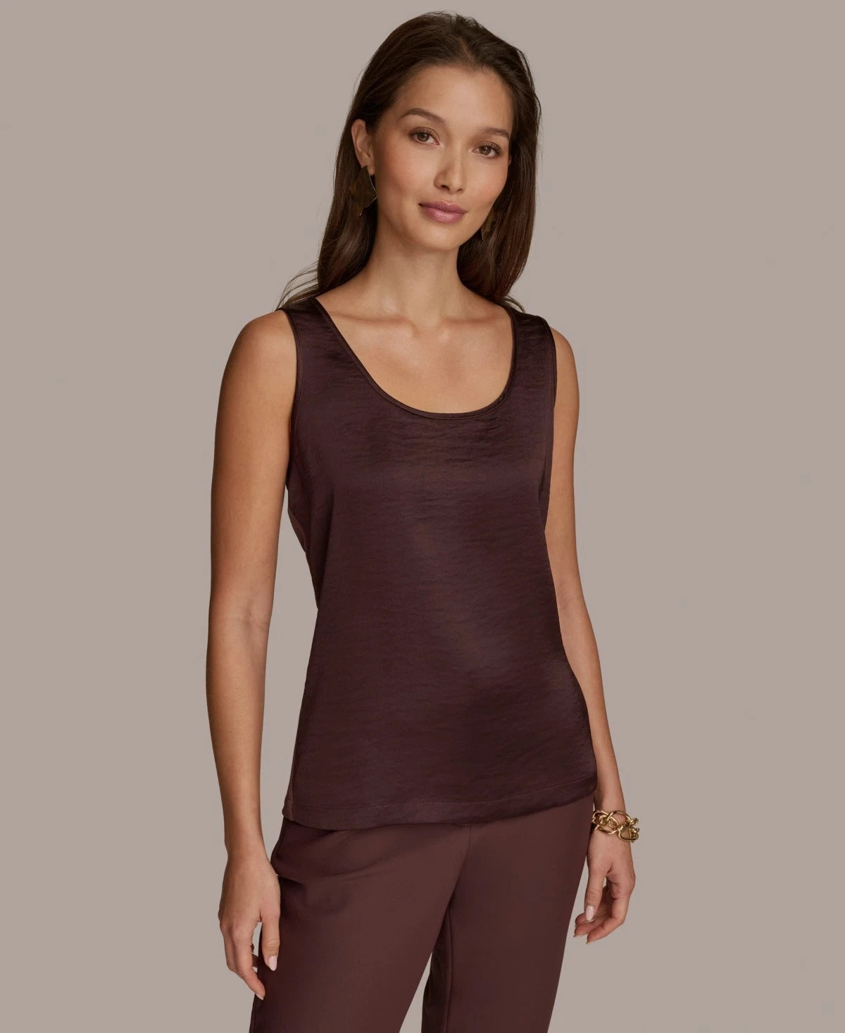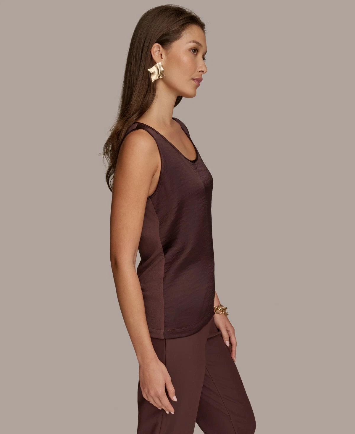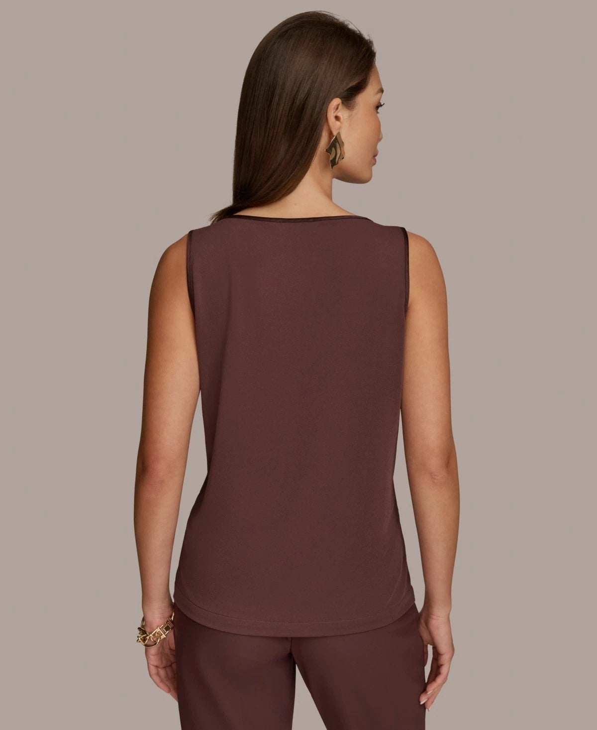Add a touch of modern elegance to your office style with this women's mixed-media scoop neck sleeveless top from Donna Karan New York, perfect for layering under blazers or wearing solo for a chic, polished look.