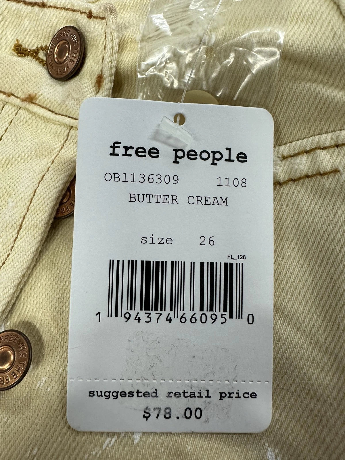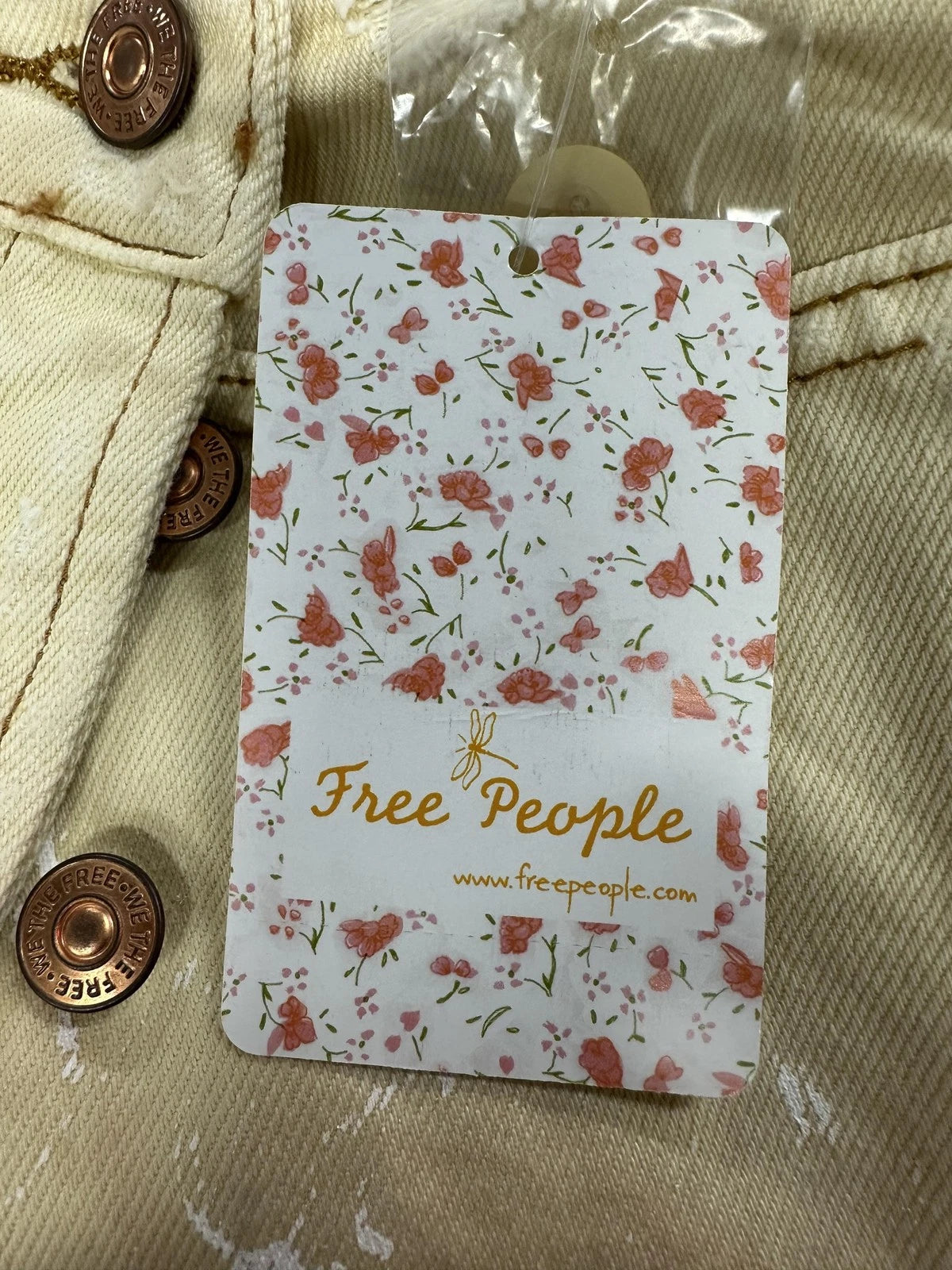 [New with tags]: Brand new with original Free People retail tags and extra button attached. Fabric is clean and intact with no stains, holes, or wear beyond the intentional distressed shredding and frayed hem. Hangtags show mild surface wear from storage and handling.
