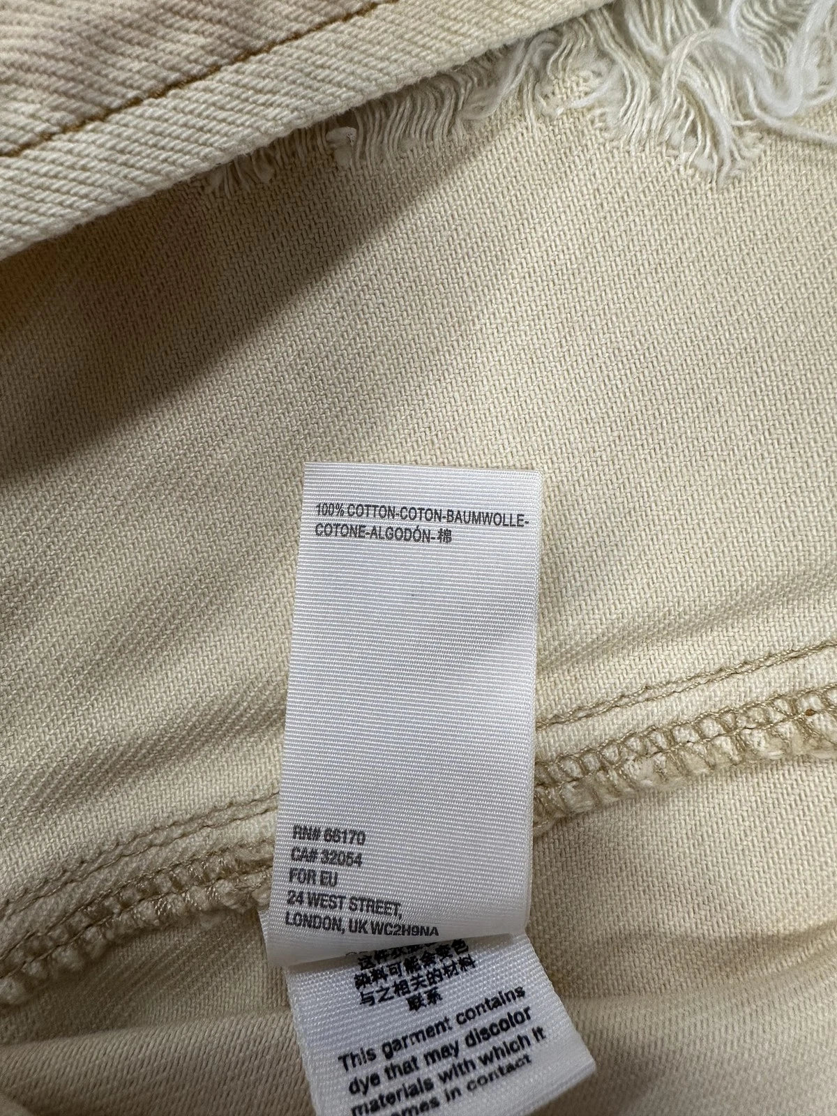 Style: High rise distressed denim mini skirt with frayed hem in Butter Cream wash