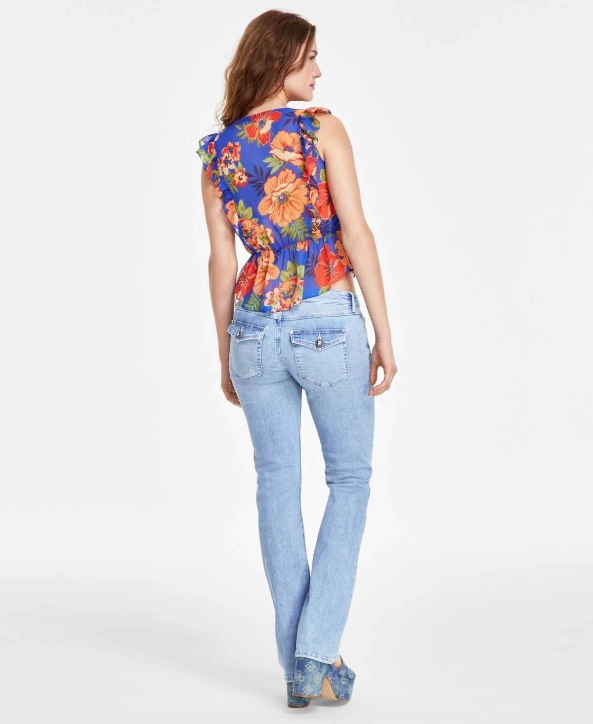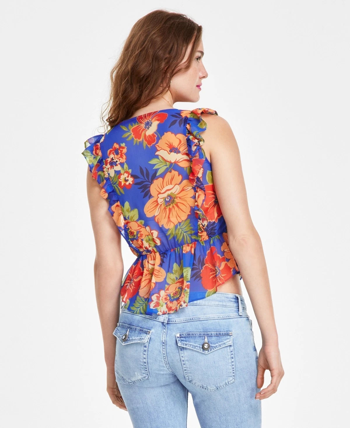 GUESS Women's Rossella Printed Ruffled Top Blue Size M MSRP $89