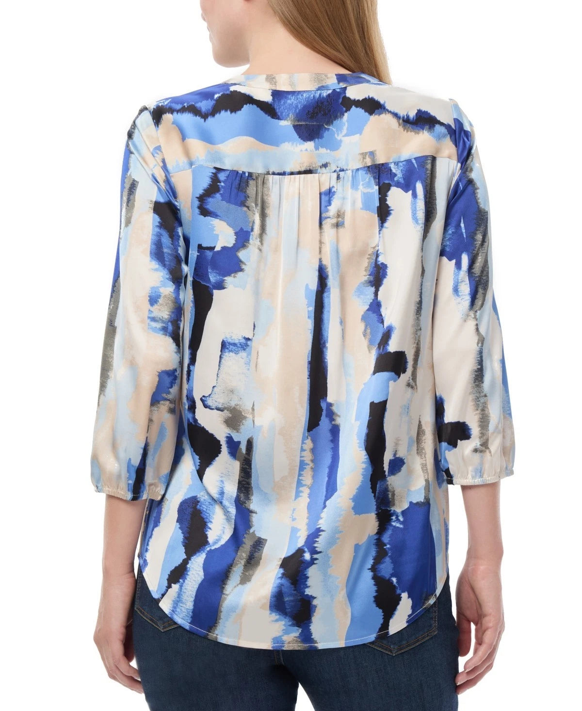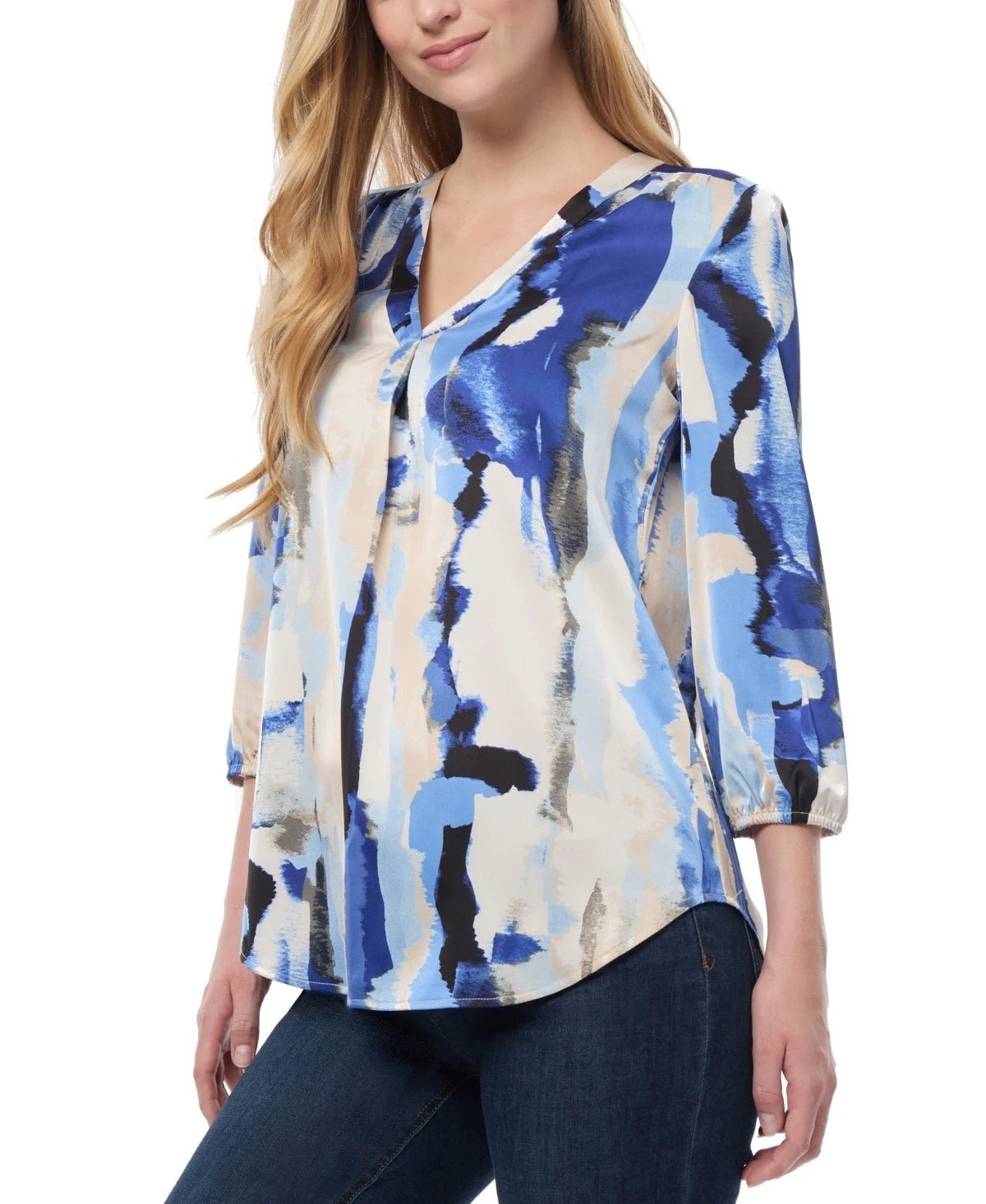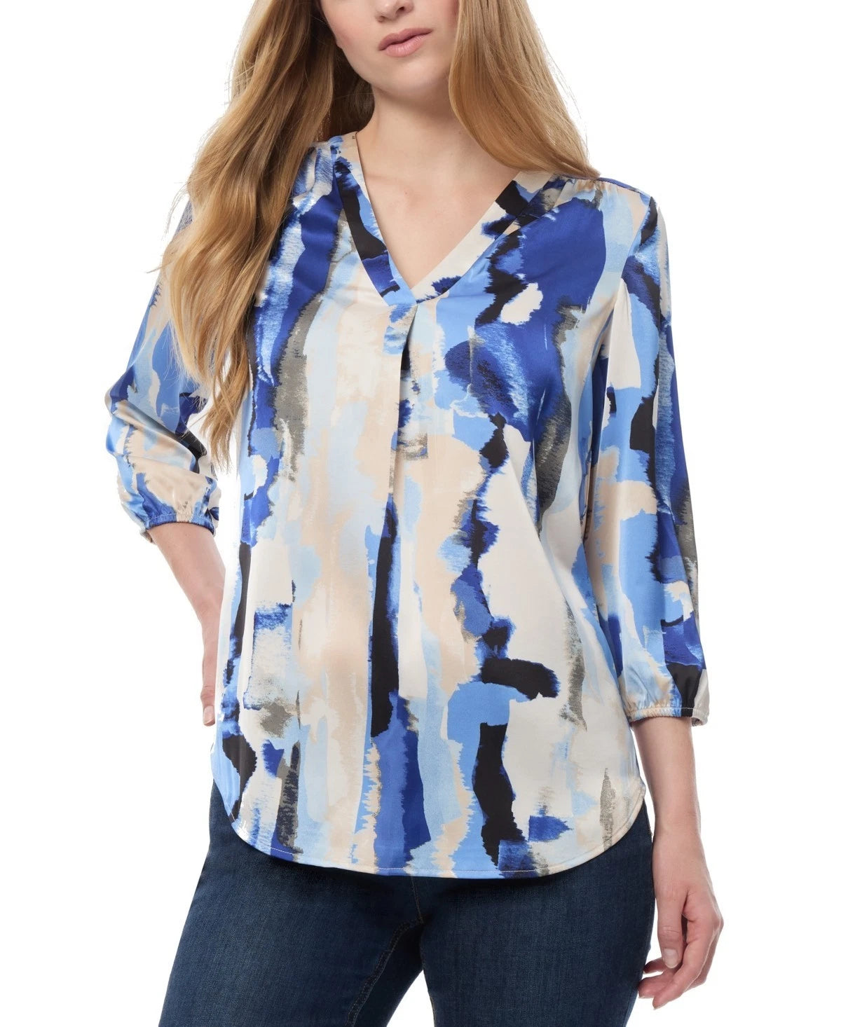 ** Hits at hip ** V-neck; pulls on ** Allover print; inverted pleat at center front ** 3/4-length blouson sleeves; elastic cuffs ** 98% polyester, 2% elastane ** Machine wash ** Imported