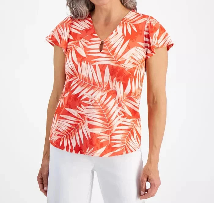 Jones New York Petite Printed Flutter-Sleeve Coral Sun Size PS Red MSRP $60