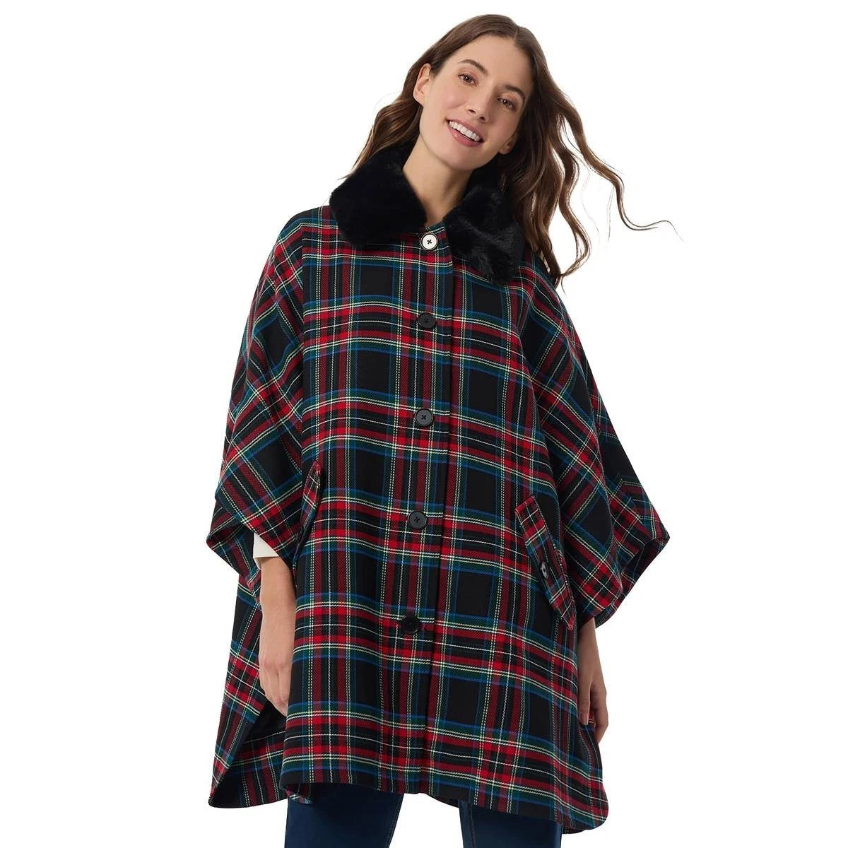 A plaid print lends a seasonal feel to this oh so chic poncho by Jones New York, finished in a snug faux fur collar.