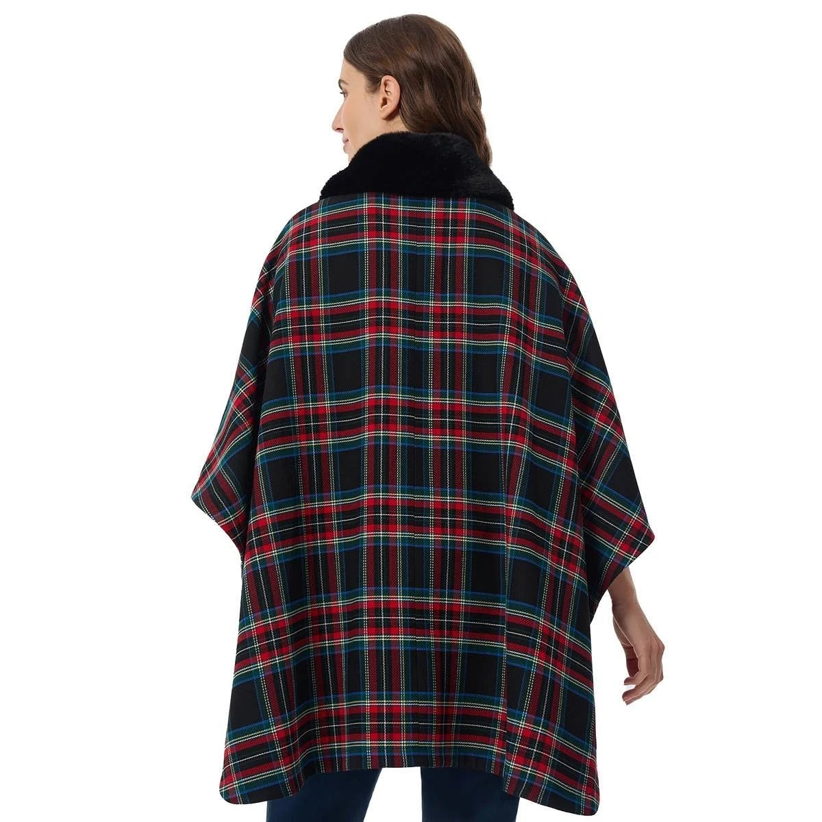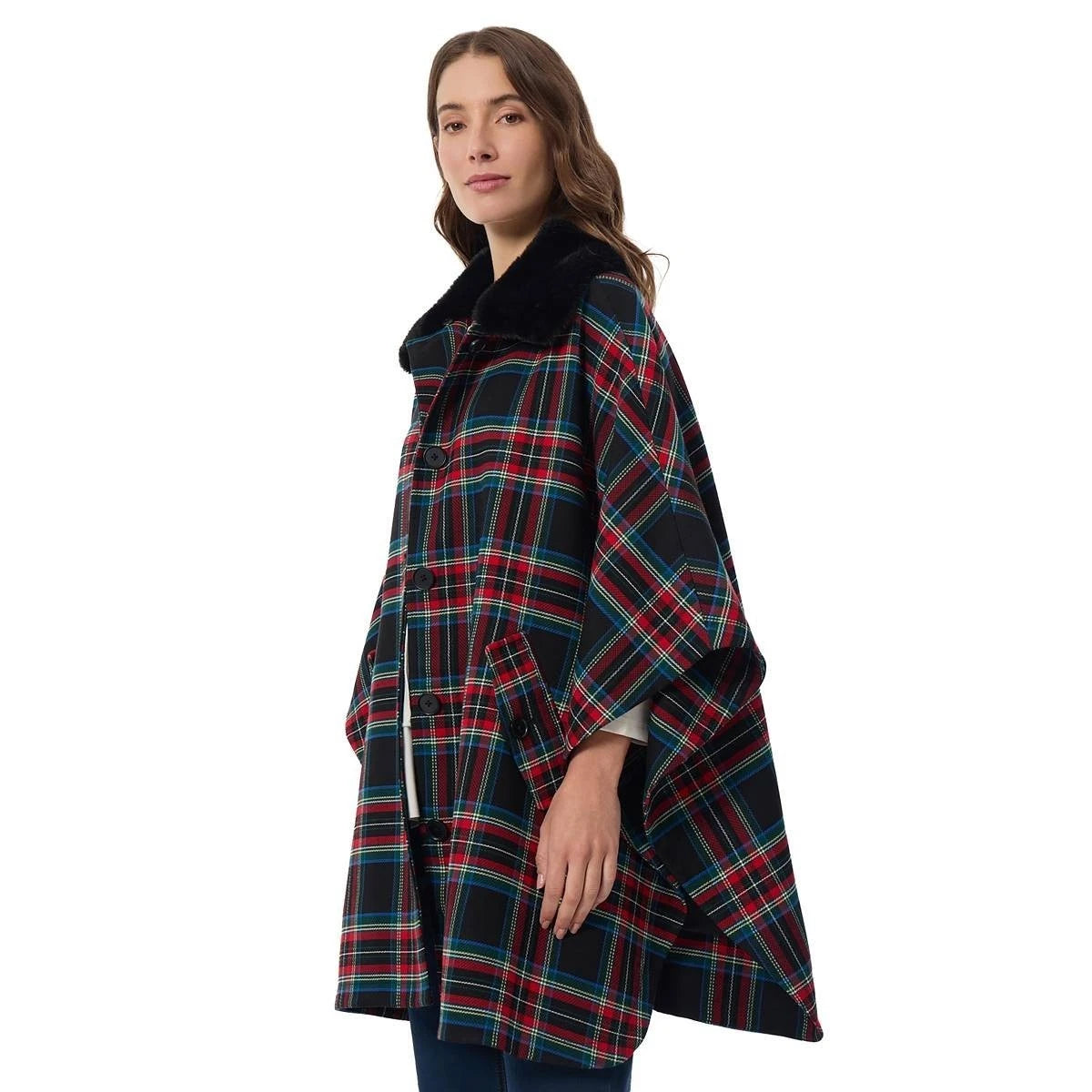 Jones New York Plaid-Print Faux-Fur Collar Poncho Red Black Size L/XL MSRP $150