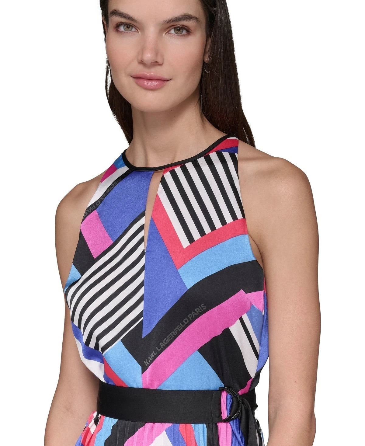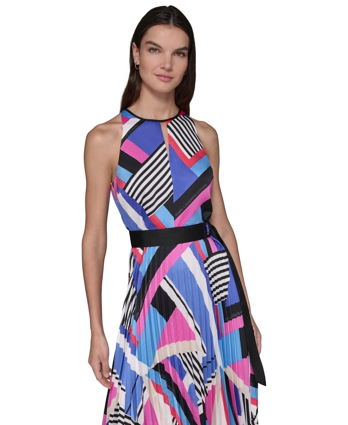 A stunning print with signature details energizes this look from KARL LAGERFELD PARIS, a sleeveless dress that flows stylishly with a pleated skirt and handkerchief hem.