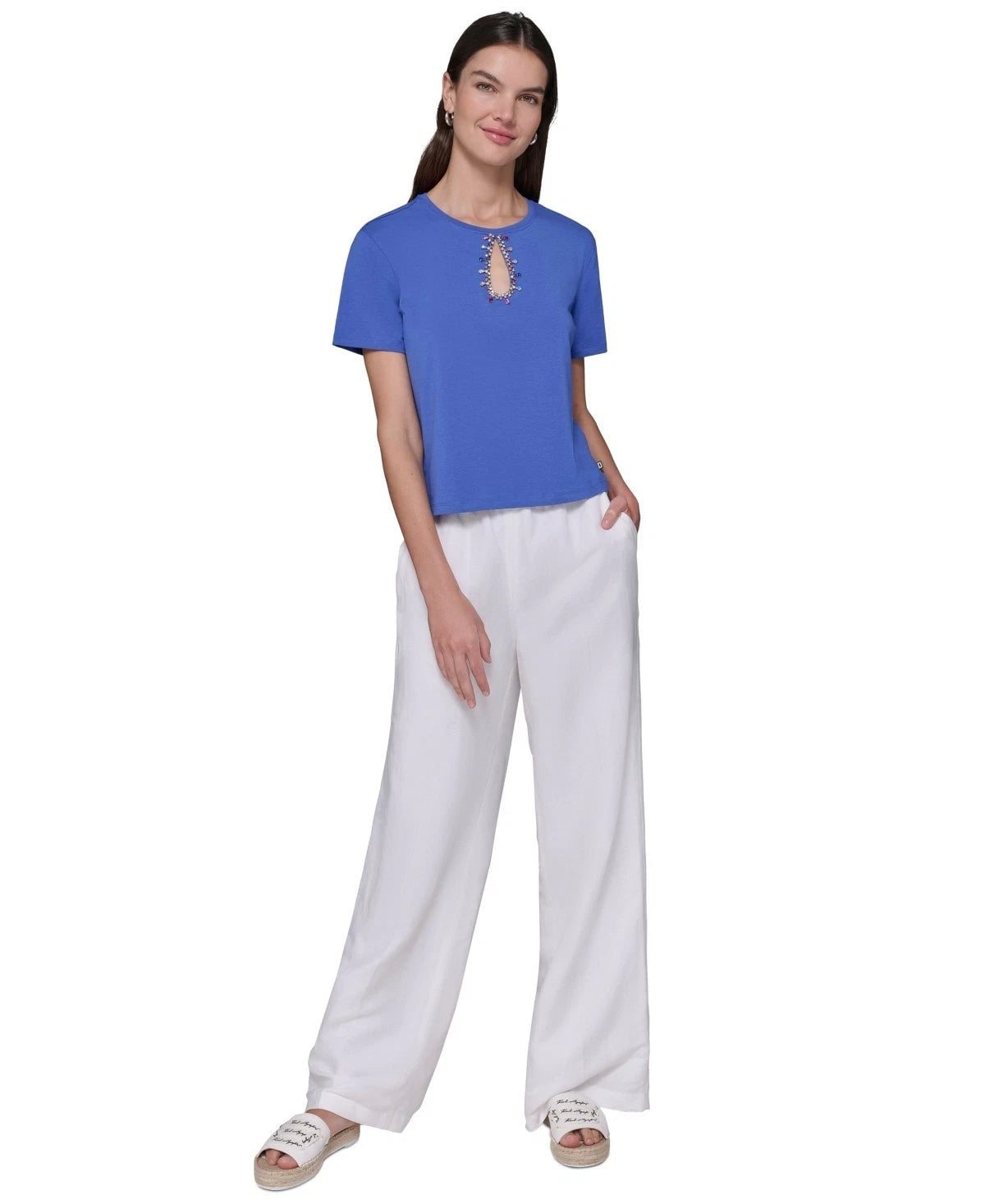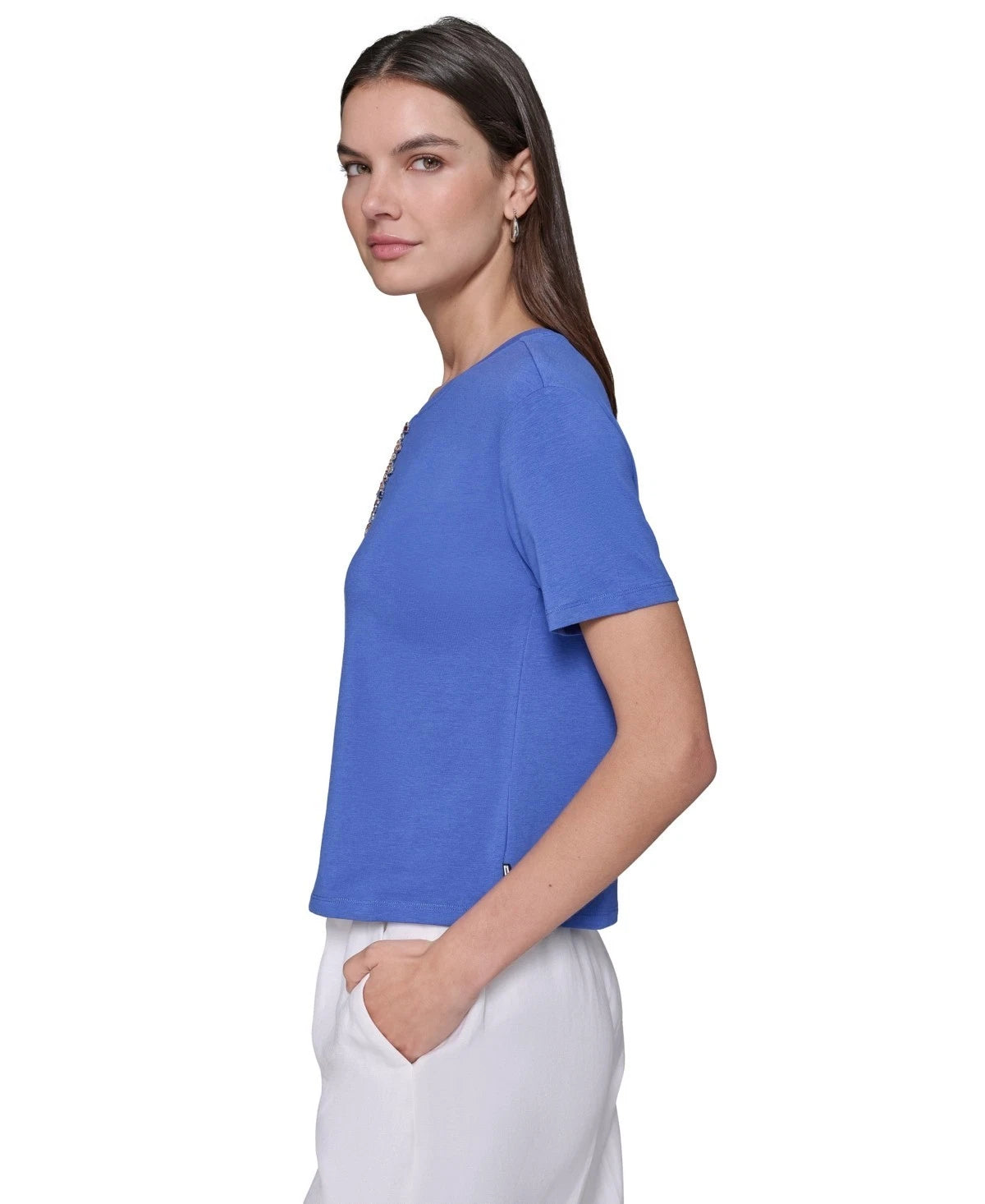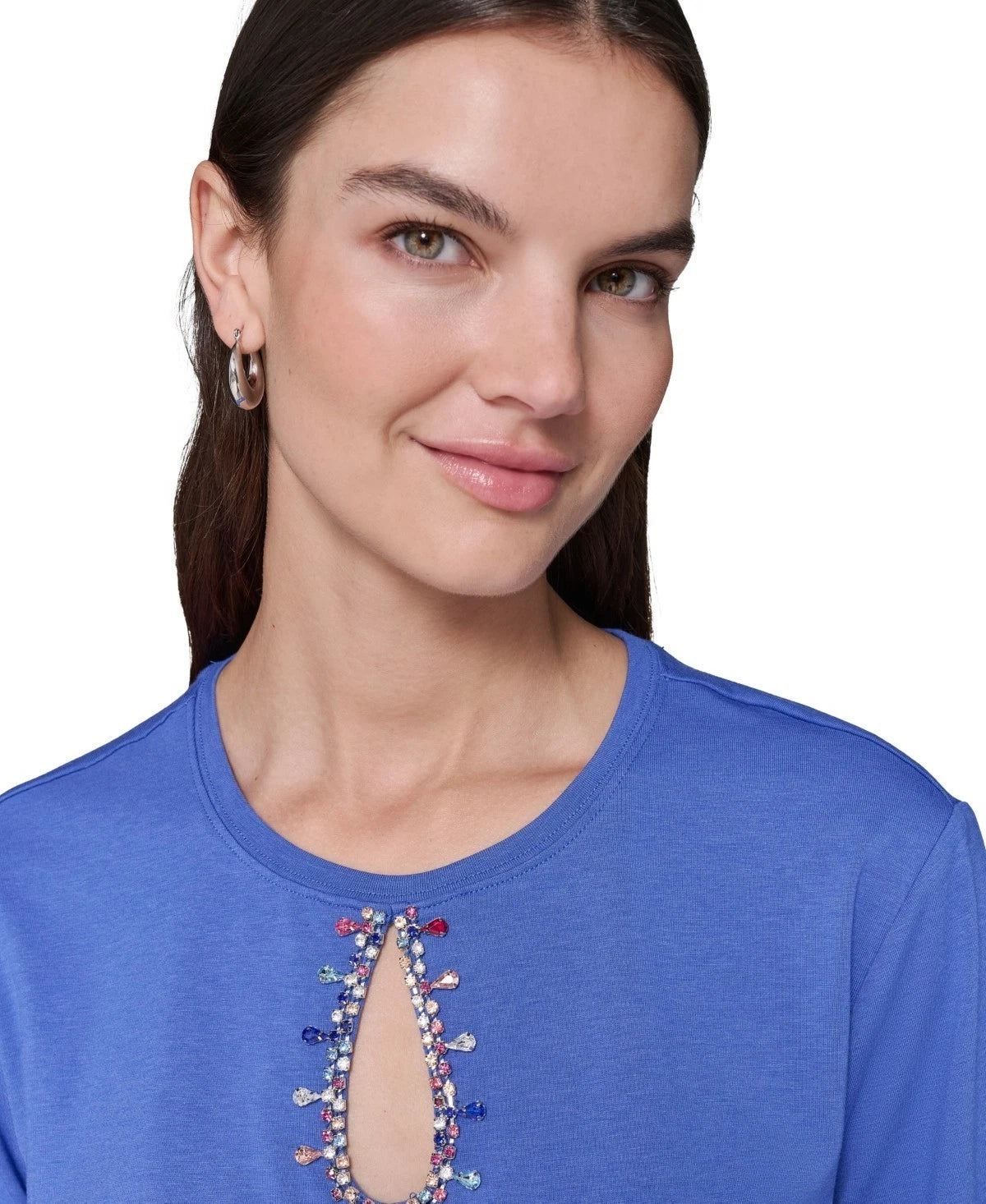KARL LAGERFELD PARIS Women's Cutout Embellished Tee Blue Size XS MSRP $69