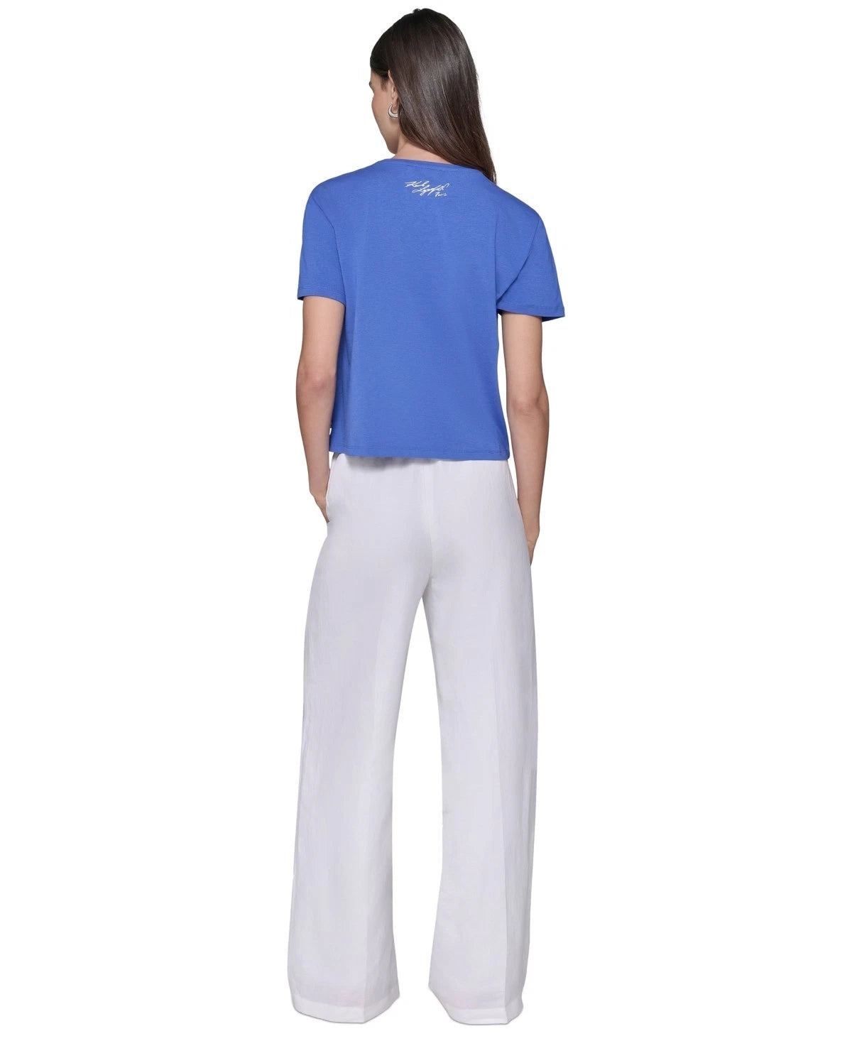 A sleek tee from KARL LAGERFELD PARIS, this short-sleeve pick features a beautifully embellished cutout and a cropped silhouette.