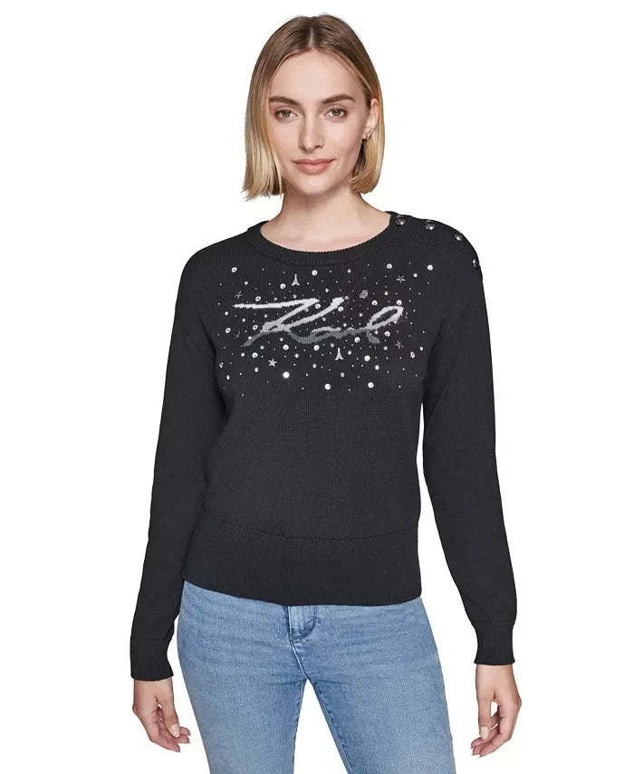 Karl Lagerfeld Paris Embellished Sweater.Color:Black.Size:M.Material:50% acrylic/35% polyamide/15% wool.Sweaters.