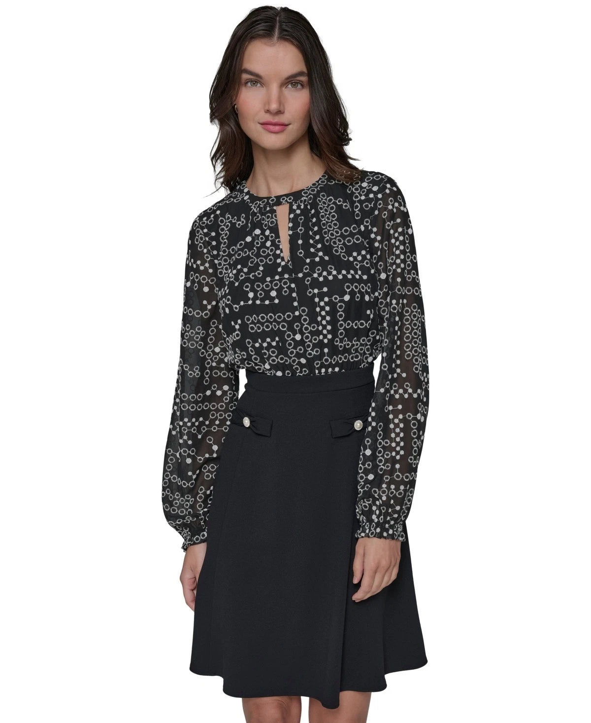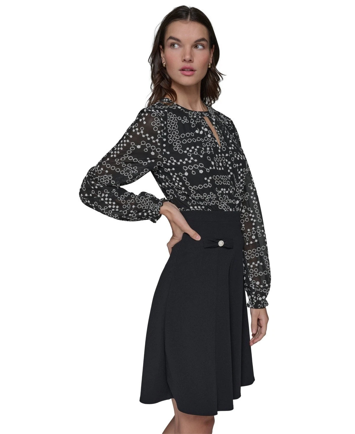 Dot-embroidered chiffon tops a scuba crepe skirt in in this modern mix, affixed with sparkling rhinestone buttons from KARL LAGERFELD PARIS.