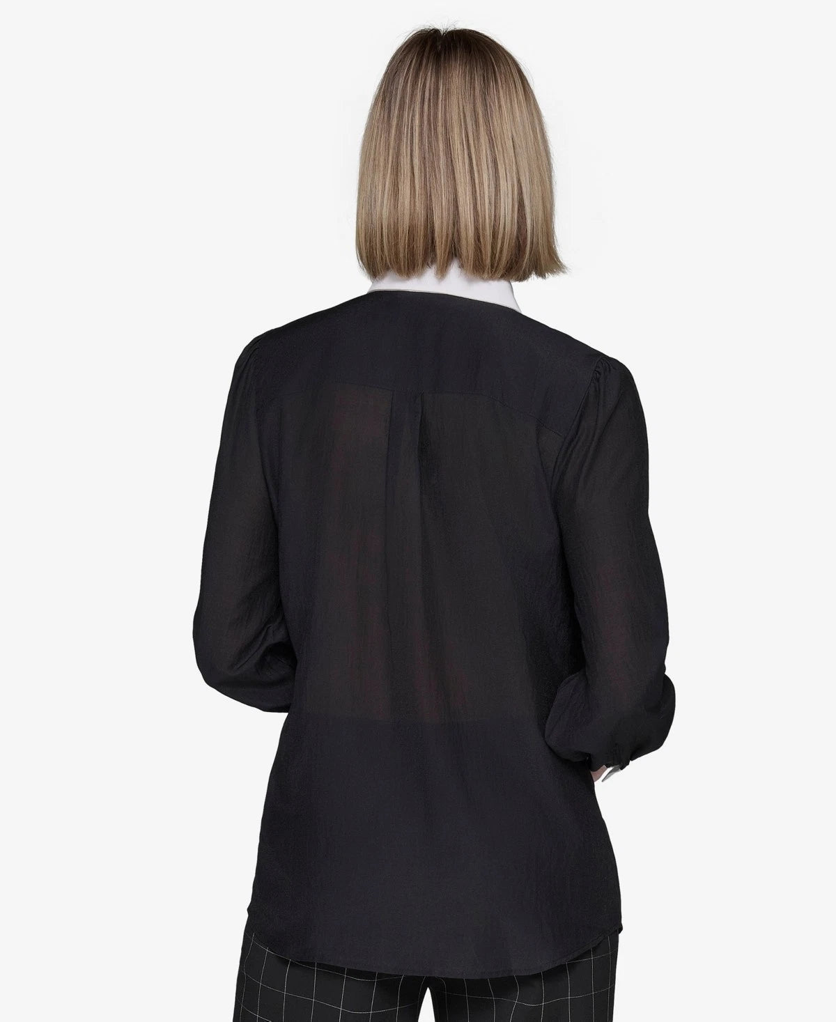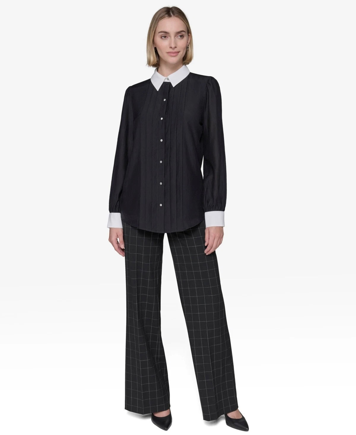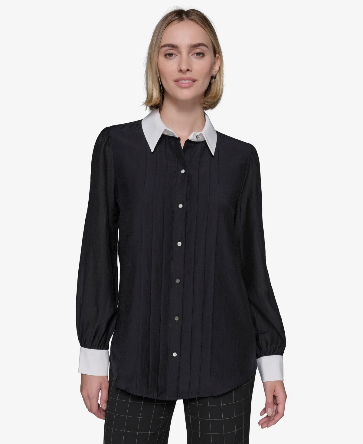 Look pretty in pintucks with this contrast-trim blouse from KARL LAGERFELD PARIS.