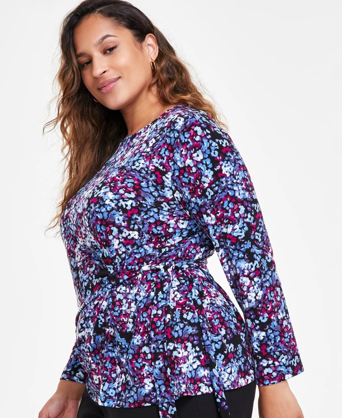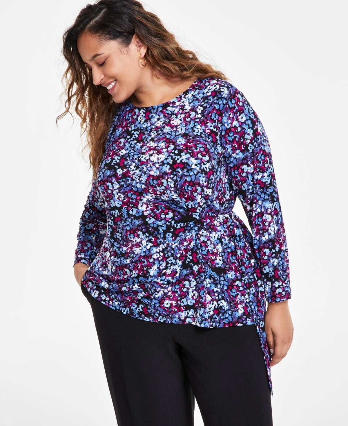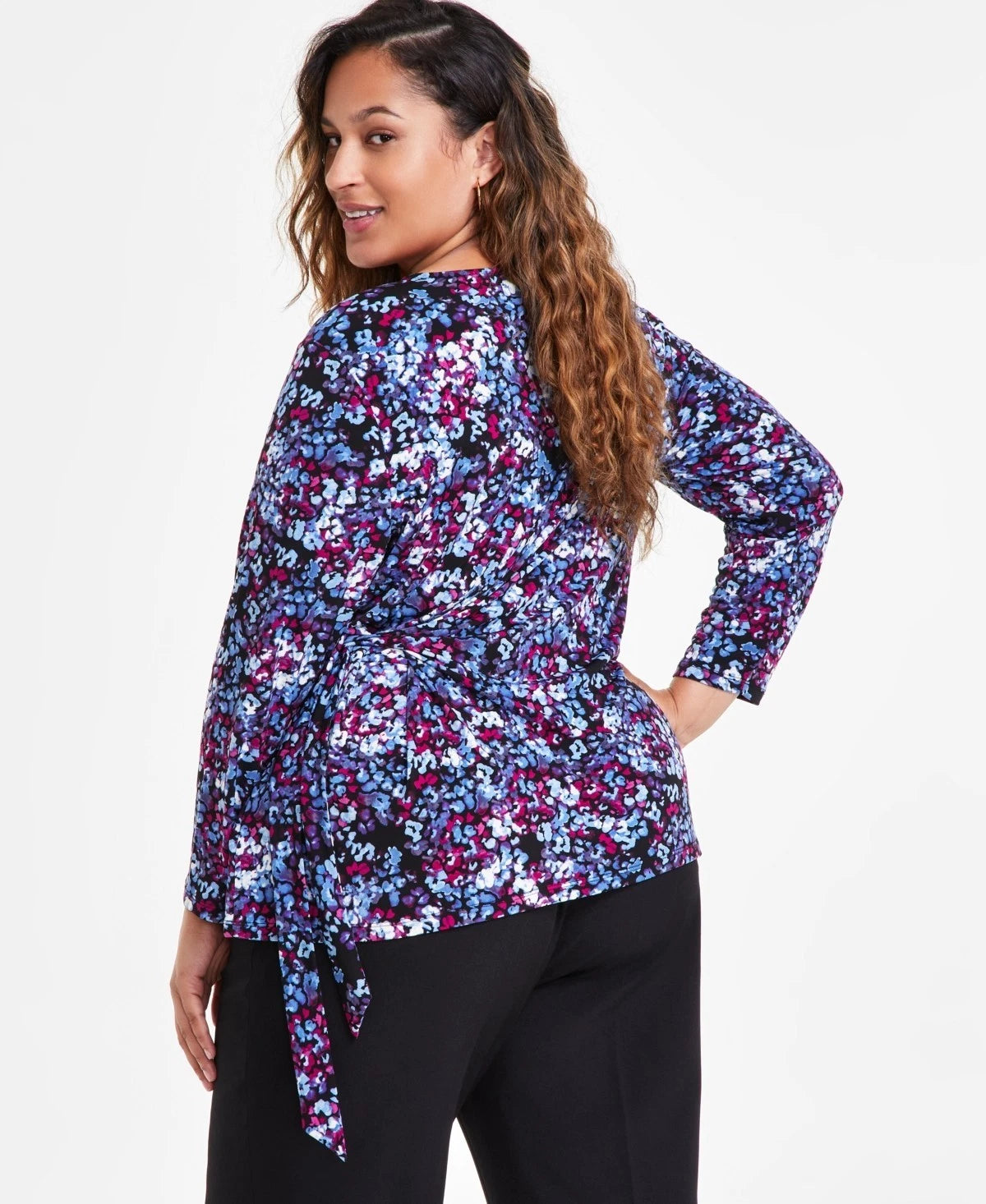 A classic weekday pick from Kasper, this plus size blouse features a colorful print and a tie at the side for a cinched fit.