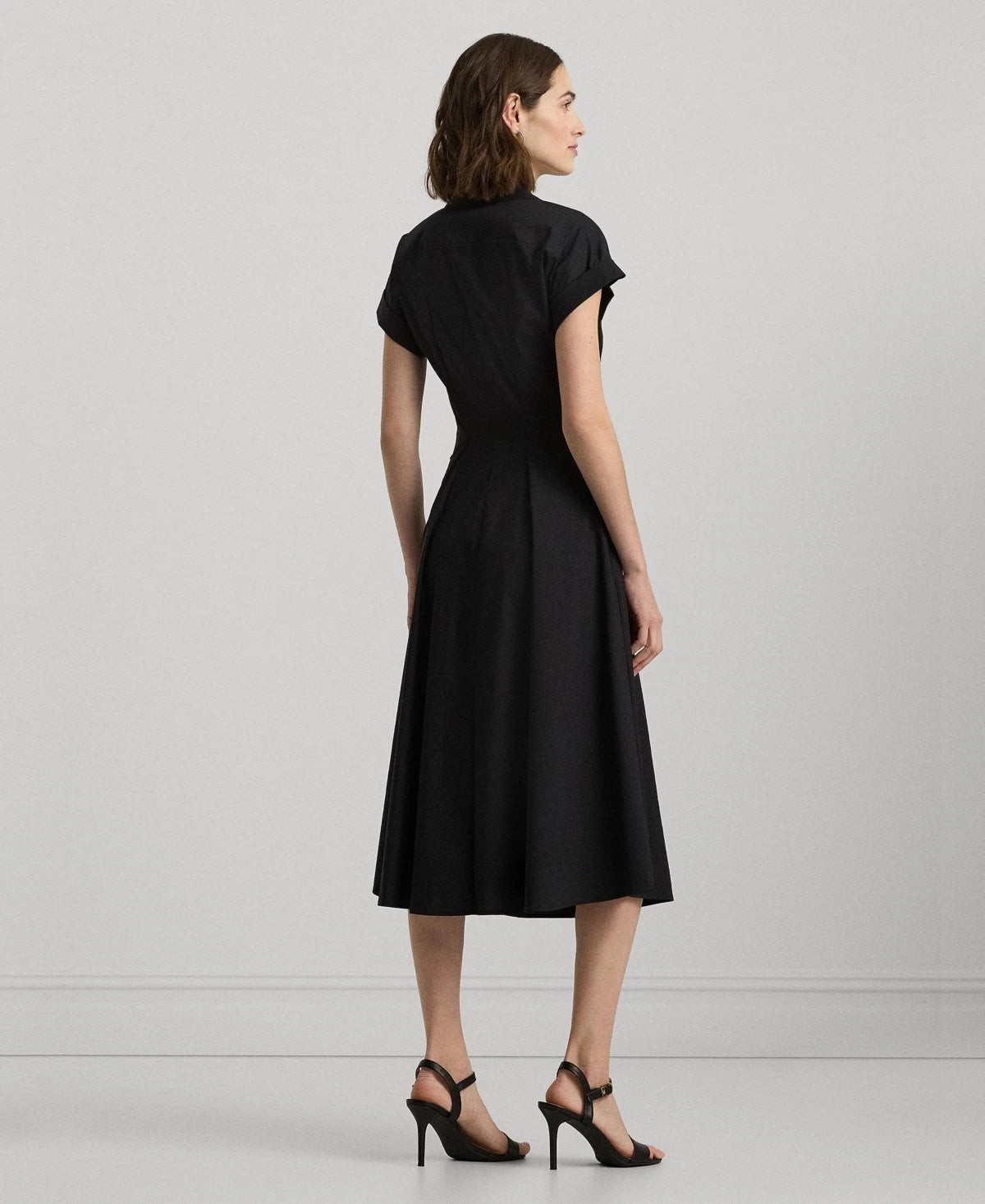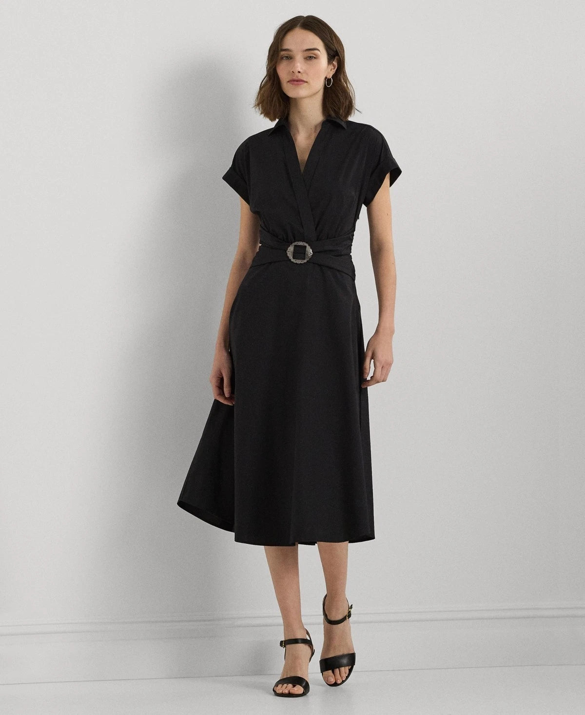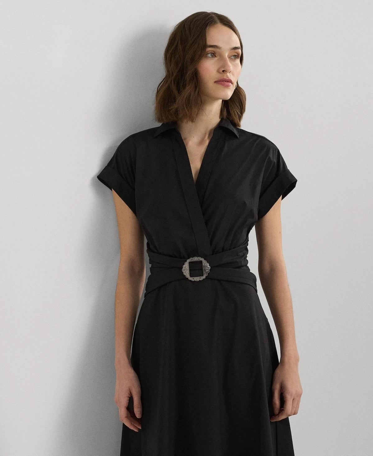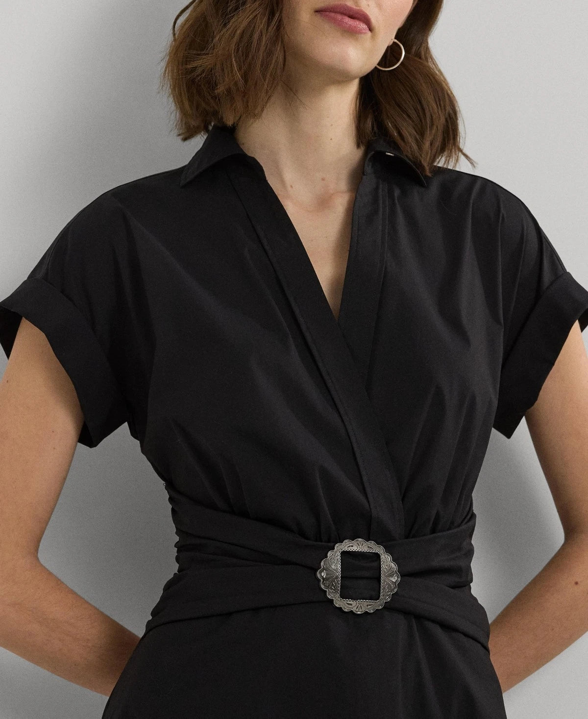Crafted from a lightweight stretch-cotton blend for a silky hand, this surplice dress from Lauren Ralph Lauren is characterized by a fabric overlay at the waist with a Western-inspired tooled metal buckle, an A-line silhouette and short dolman sleeves with rolled cuffs. A spread collar and back waist darts offer a tailored finish.
