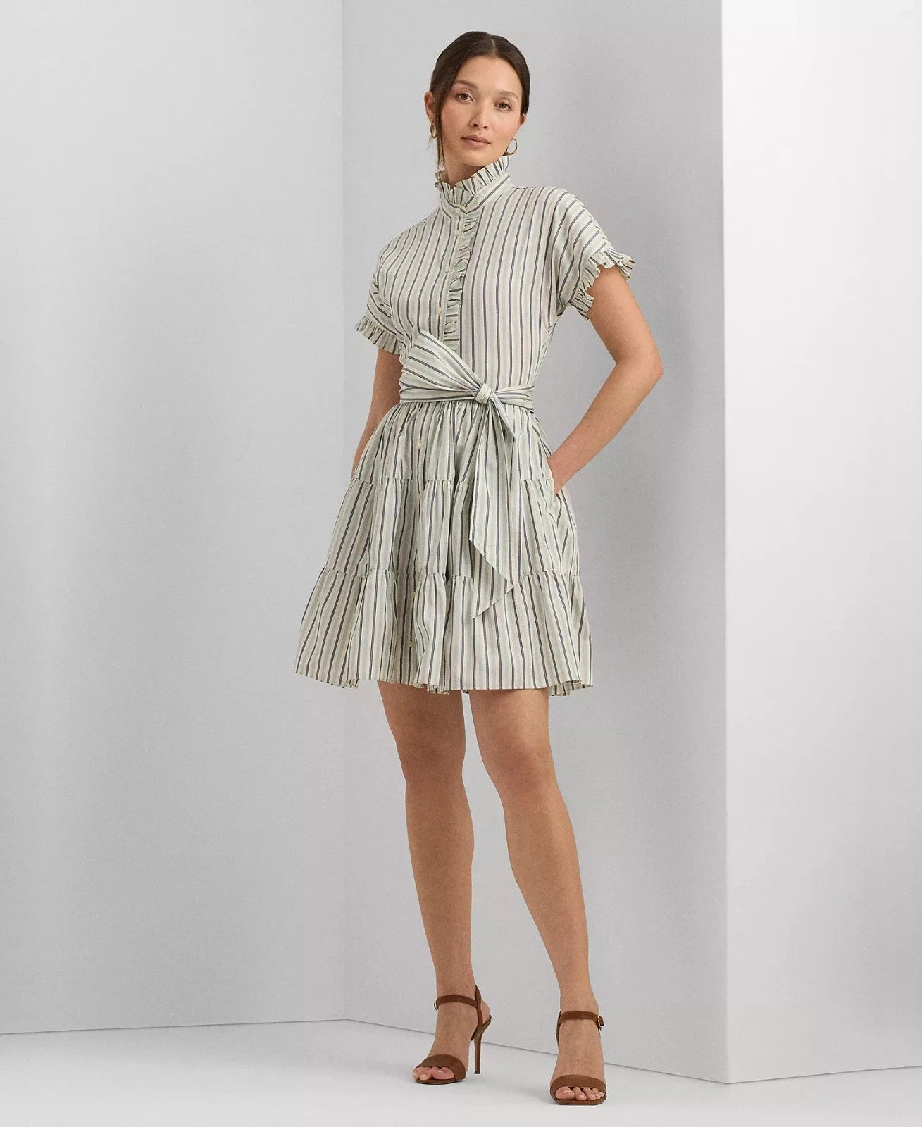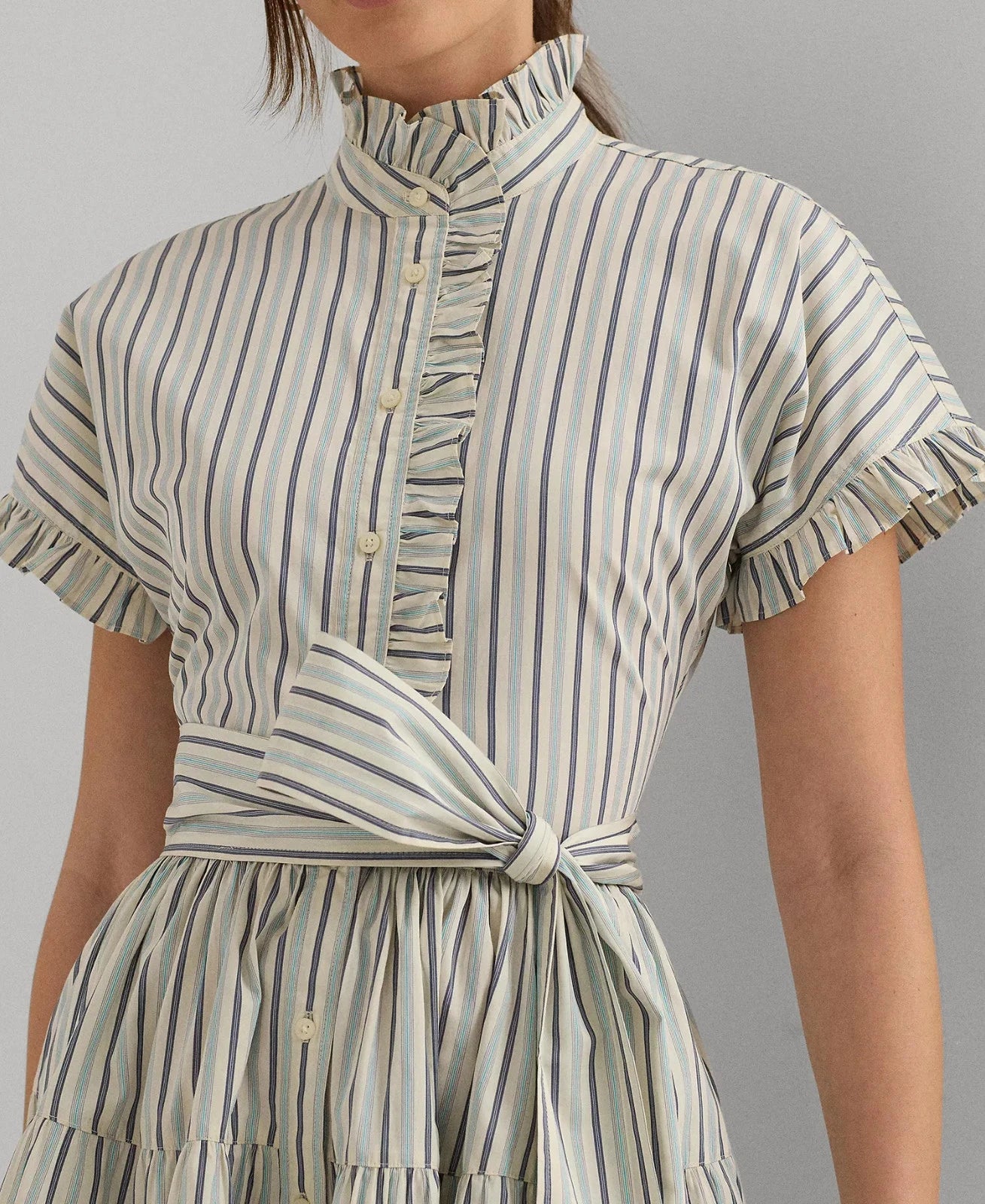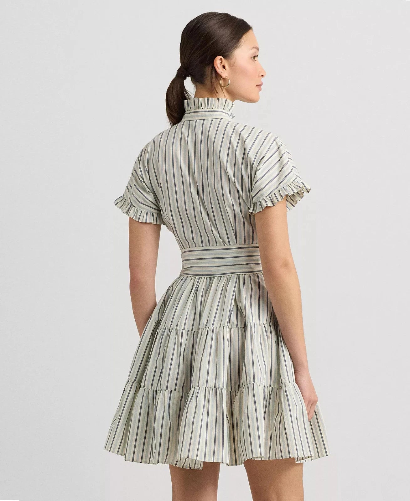 ** Fit-and-flare silhouette ** Ruffled band collar ** Ruffle-trimmed buttoned placket; "Lauren Ralph Lauren"-engraved buttons ** Short sleeves with ruffle-trimmed cuffs ** Threaded belt loops; comes with a removable self-belt ** Tiered skirt ** Shirring into the tier seams ** 100% cotton ** Machine wash or dry clean ** Imported