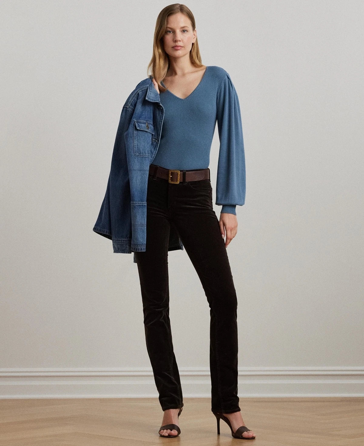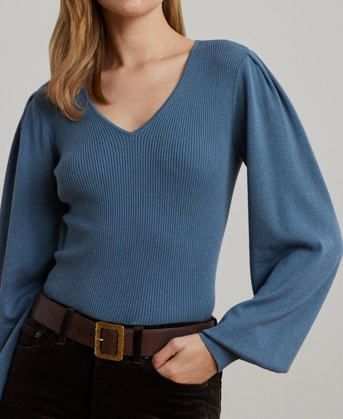 Voluminous blouson sleeves bring a romantic sensibility to this slim-fitting V-neck sweater from Lauren Ralph Lauren, which is rib-knit with a soft cotton blend.