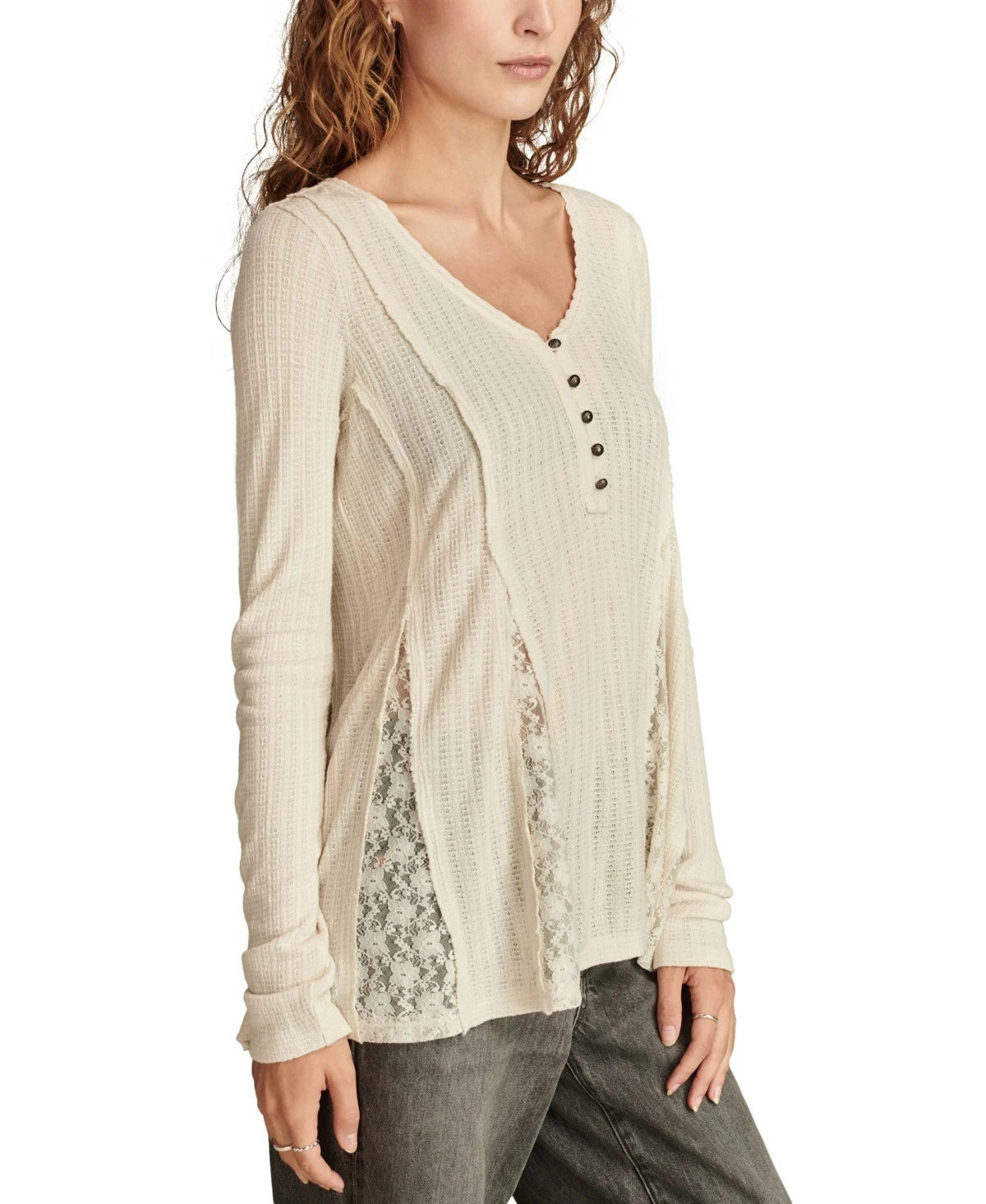 ** Imported ** Henley V-neck; button-and-loop closures ** Textured knit fabric ** Seaming details and lace godet insets at side front and side back ** Long sleeves