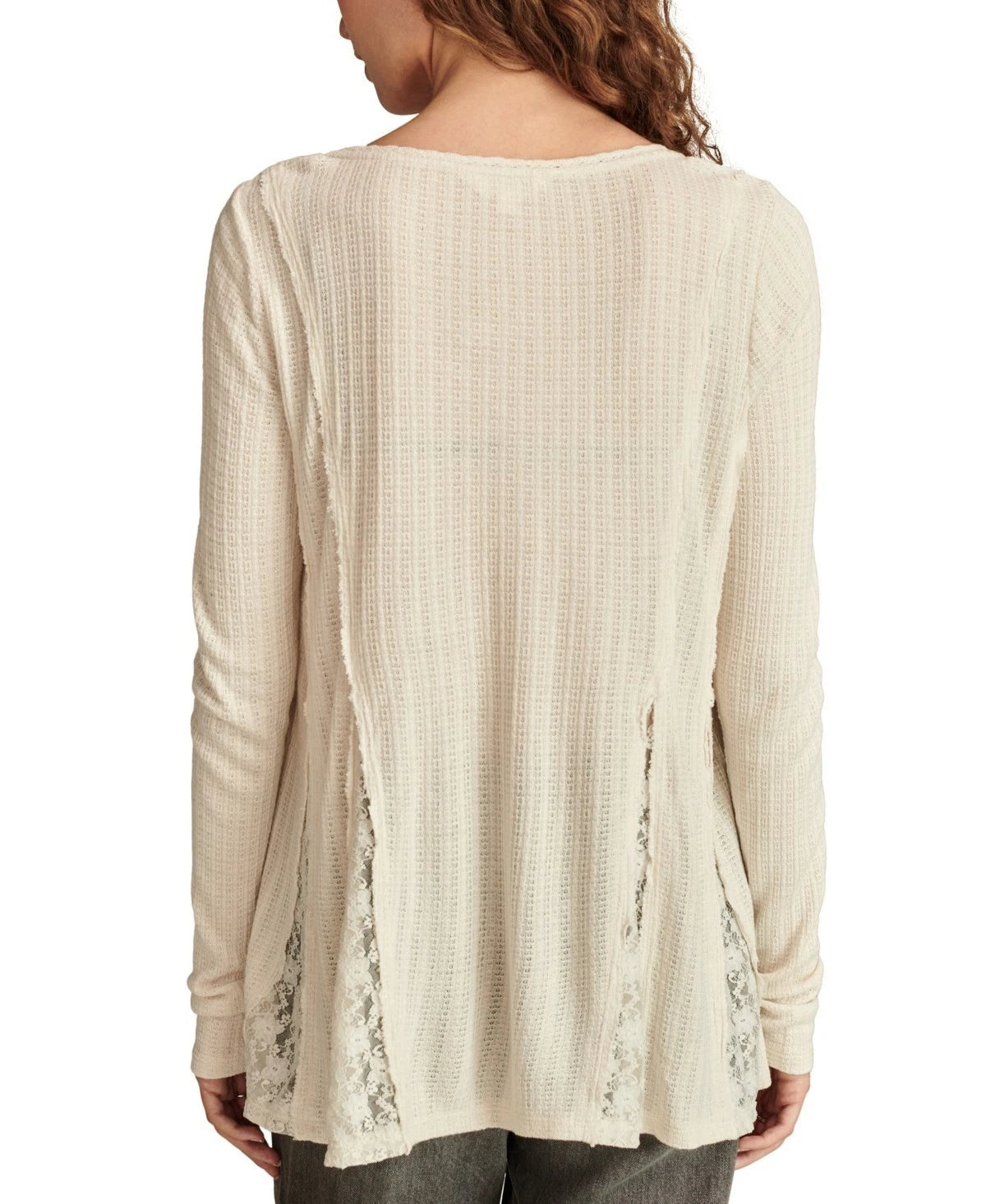 Tonal lace godet insets deliver swingy style to this soft lightweight textured knit top from Lucky Brand.