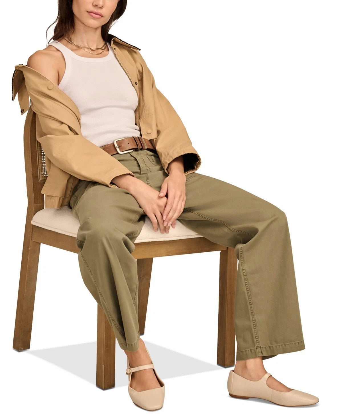 ** Button and zipper front closure; belt loops