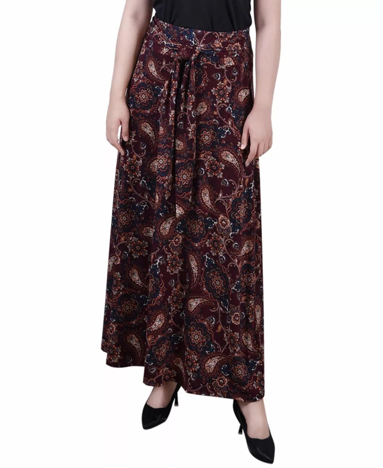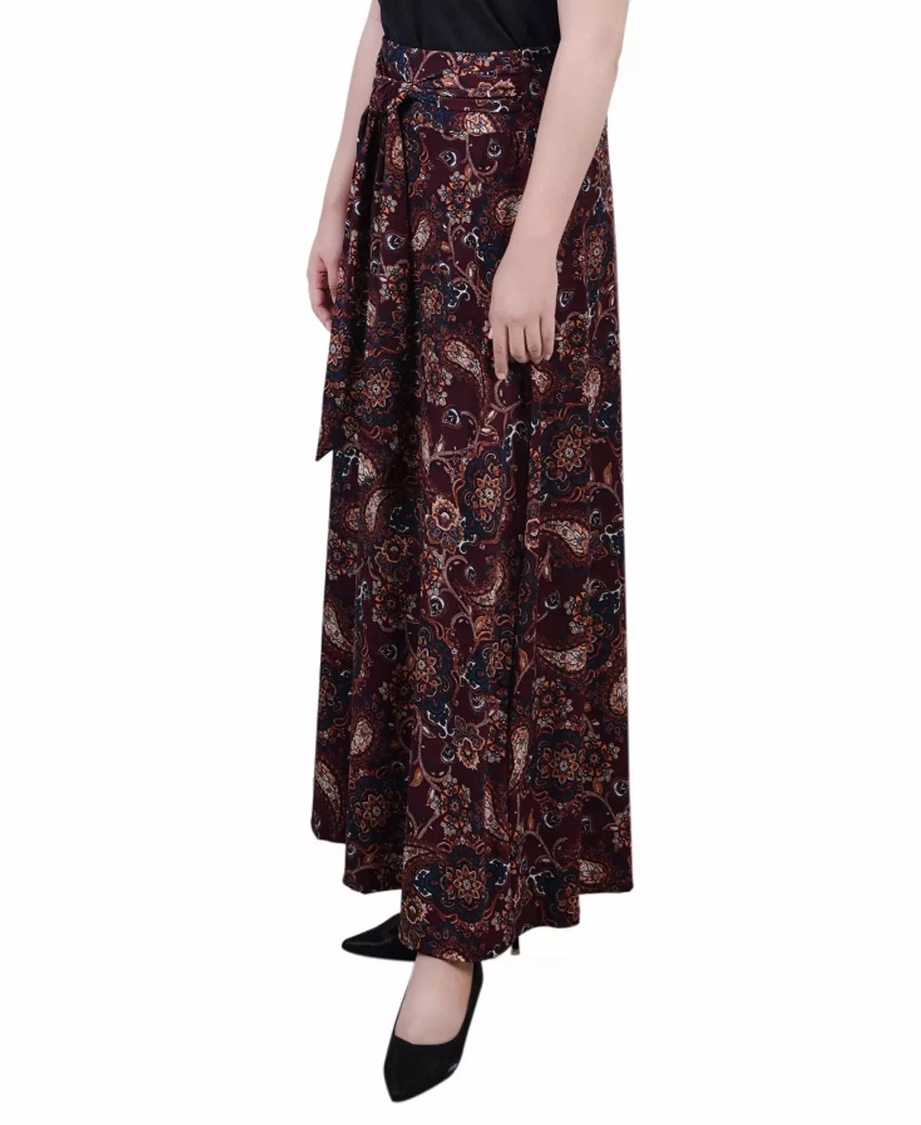 NY Collection Petite Printed Maxi Skirt with Sash Waist Tie Wine Red Size PL
