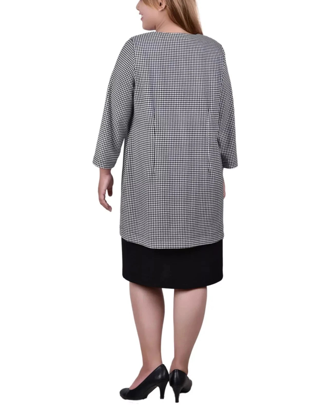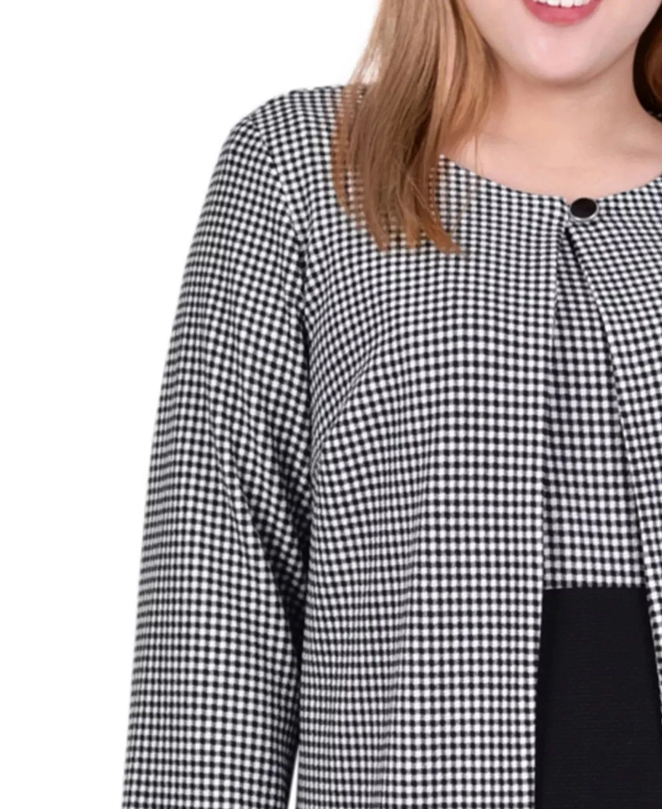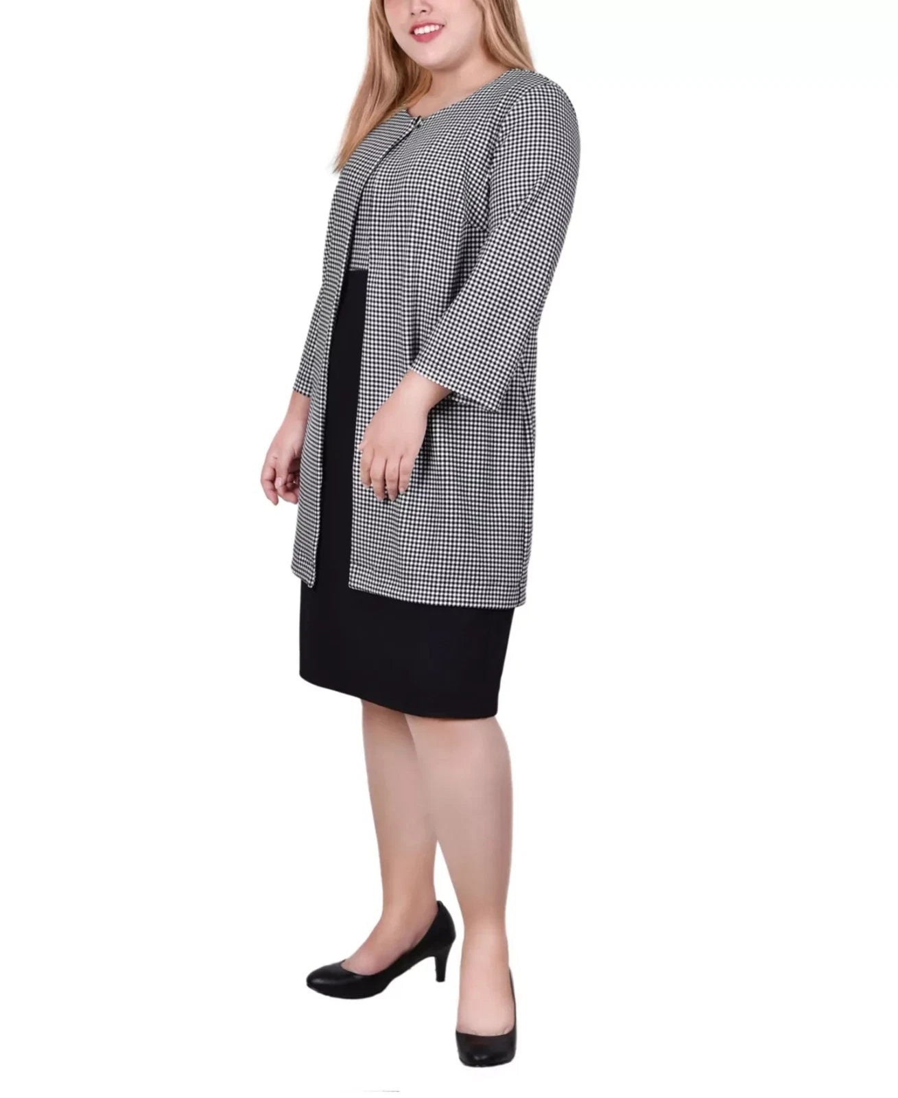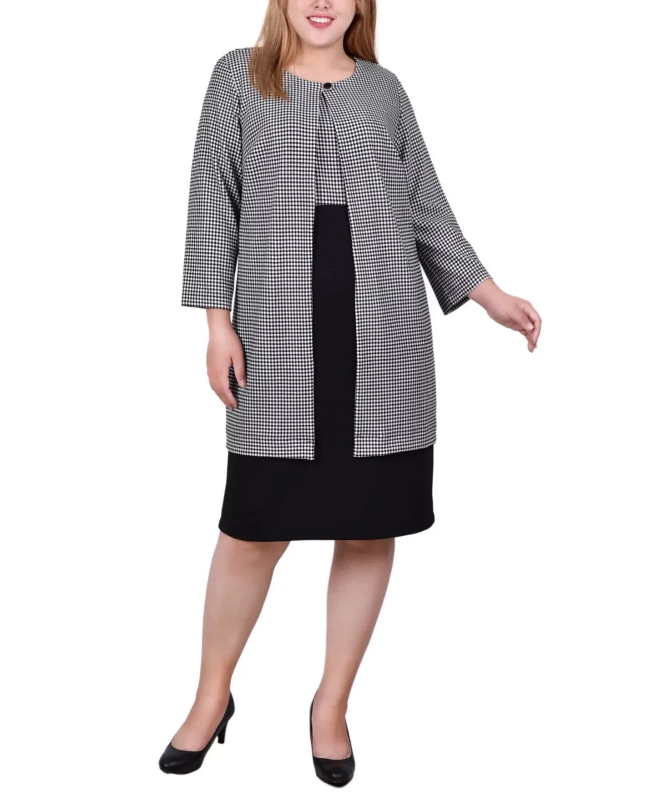 With a 3/4 sleeve checkered jacket, this NY Collection two piece dress is perfect for any work day.