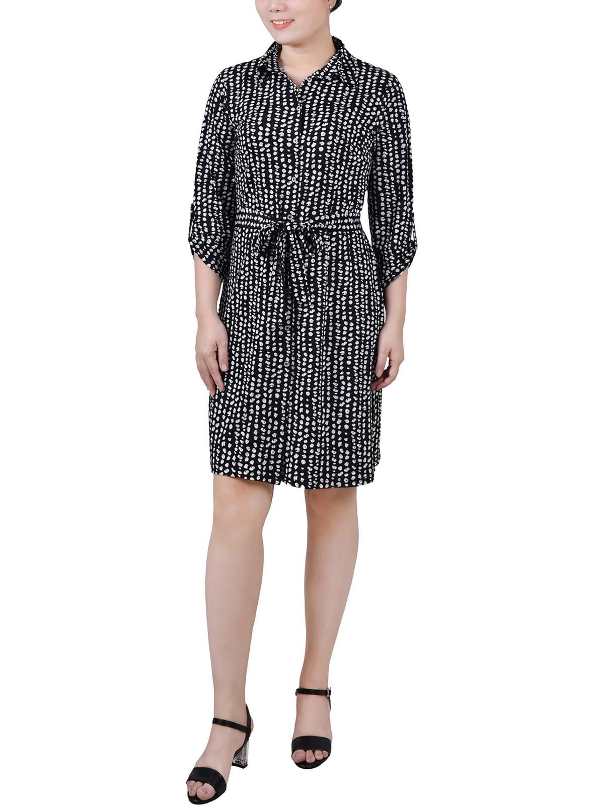 NY Collection presents this versatile button-up dress, finished with roll-tab sleeves and a collared top for the perfect daytime look. Button-front closures; self-tie belt at waist Button-front dress Point collar Imported 3/4-roll-tab sleeves Unlined