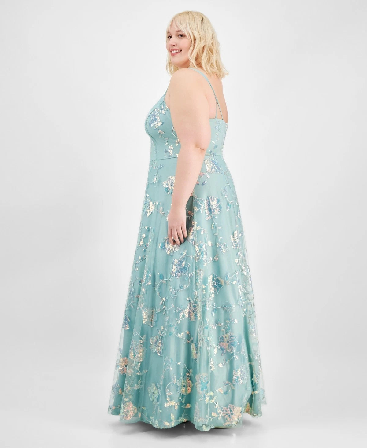 A dreamy dazzler, with sequined embroidered blooms on airy tulle, this Say Yes plus size ball gown is a glam formal find.