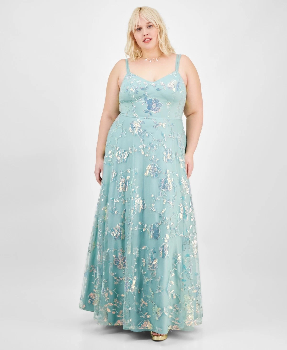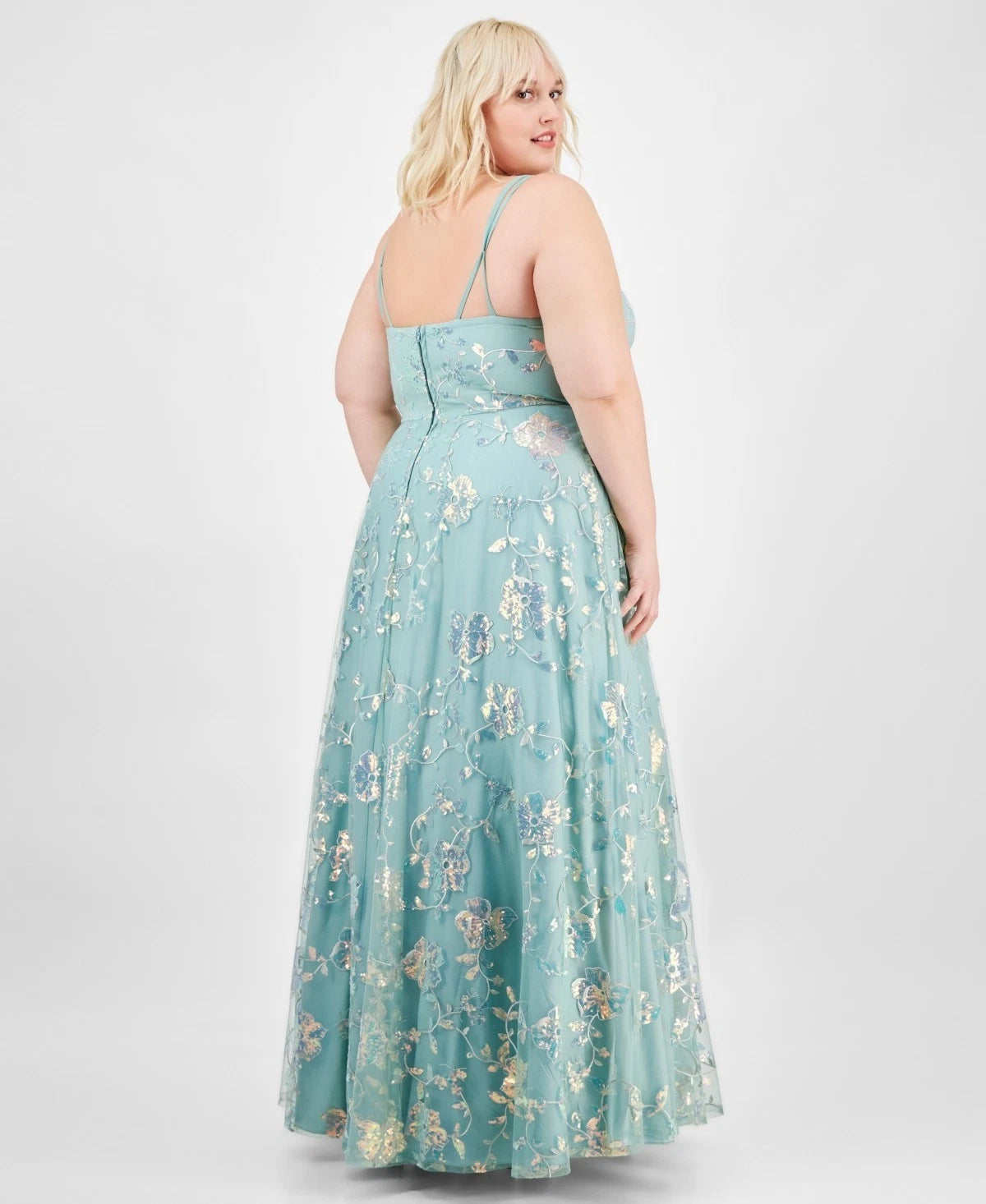 ** Floor-length formal dress with a skirt that flares from the waist ** Embroidered tulle fabric with sequined floral motifs ** V-neck; Ball gown silhouette ** Zipper at center back ** Sleeveless with split straps ** Built-in bust padding; waistline seam ** Sequins may shed during wear ** Lined ** Nylon; lining: polyester ** Dry clean ** Imported