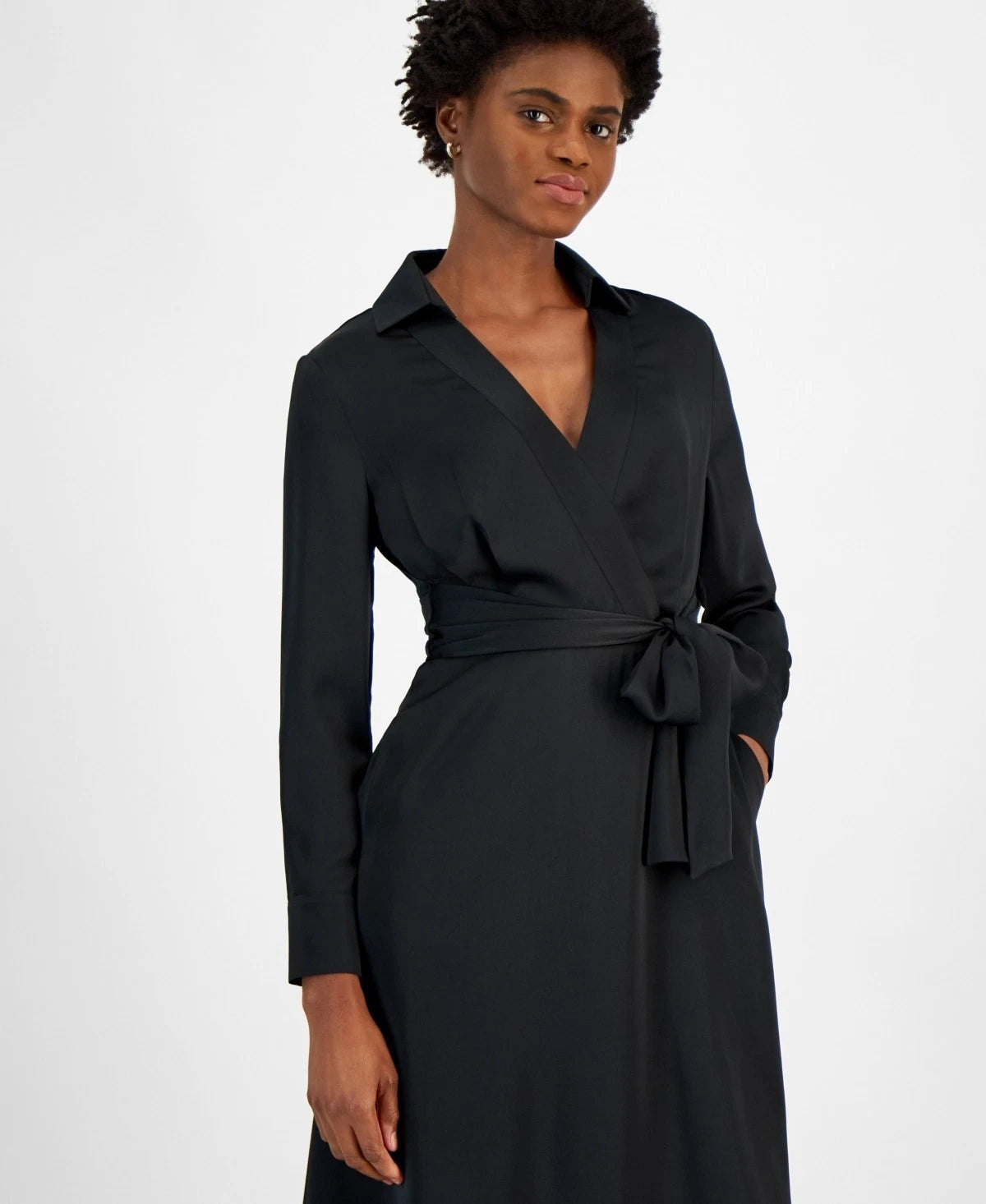 A crisp wrapped collar and waist tie lend polish to this midi-length dress from Tahari ASL.
