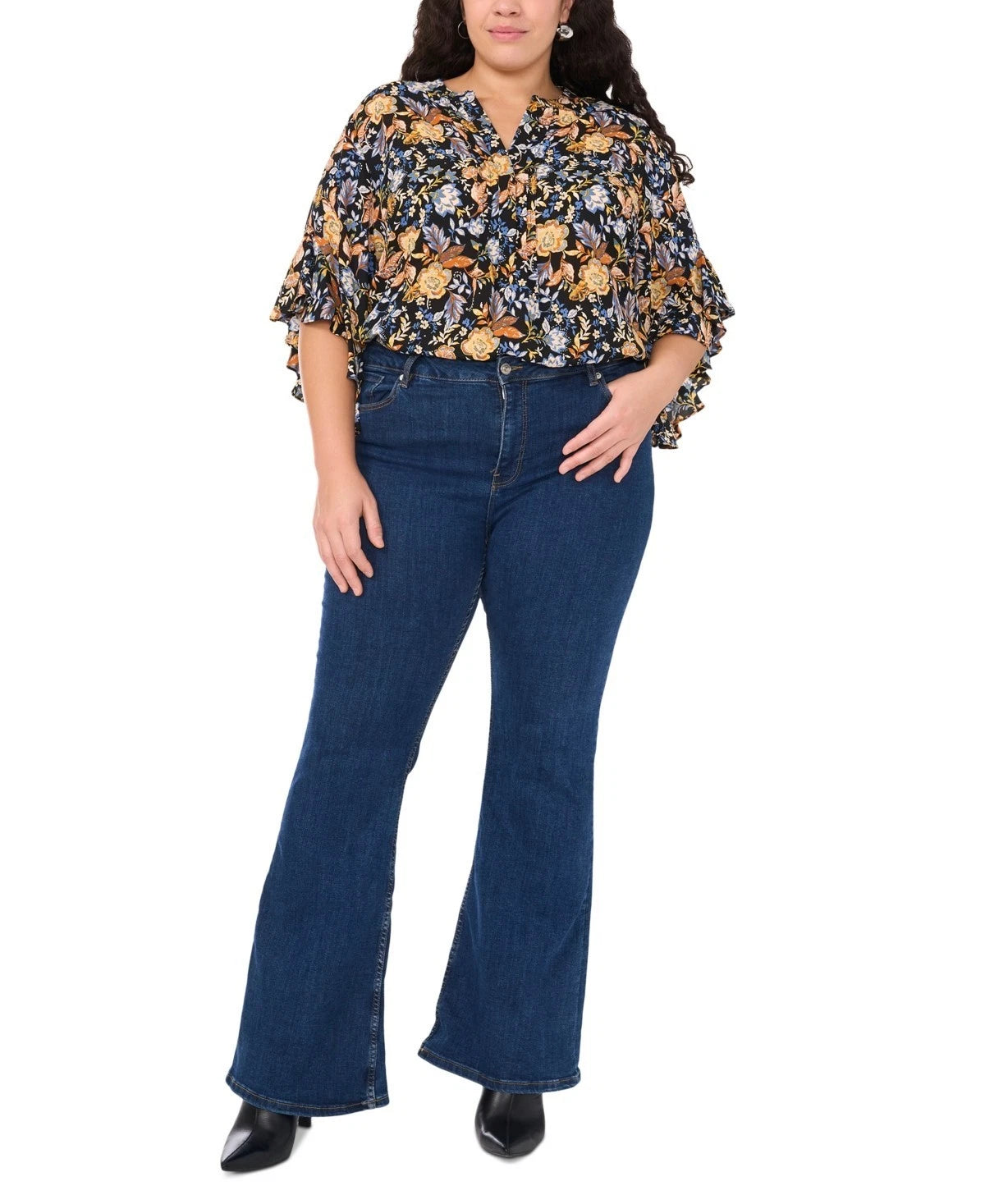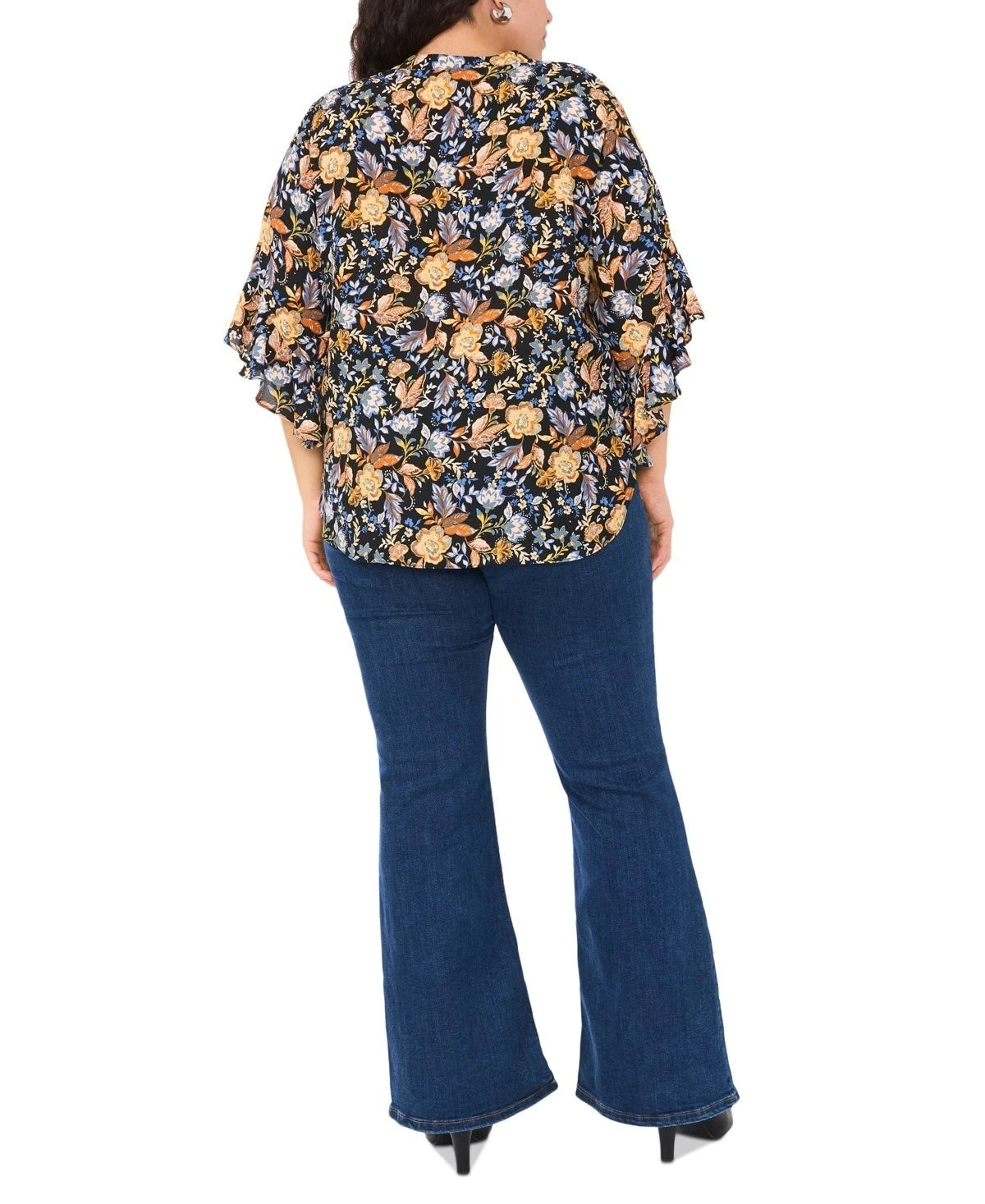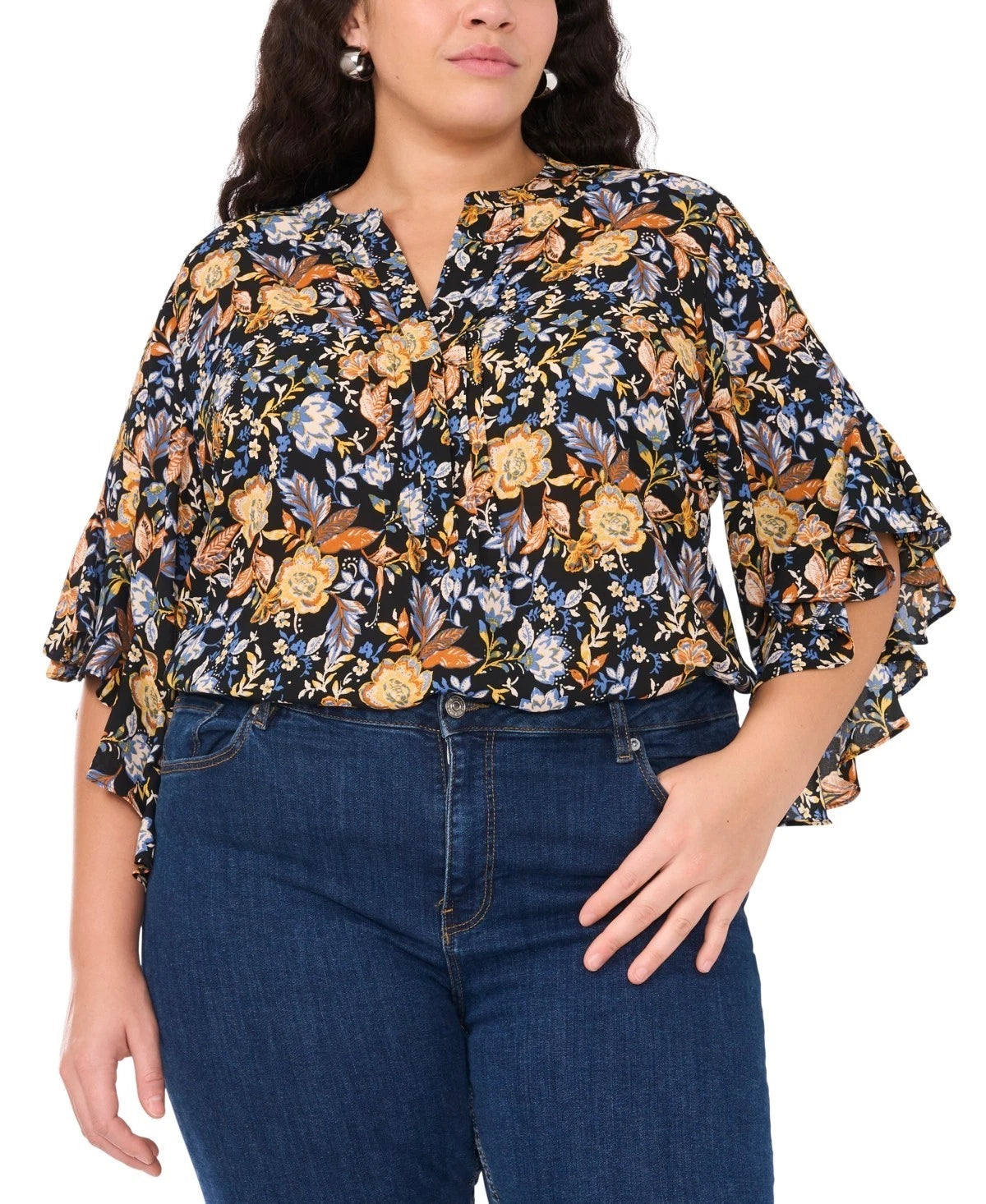 Vince Camuto Plus Size 2X Floral Flutter 3/4-Sleeve Henley Blouse Black $89