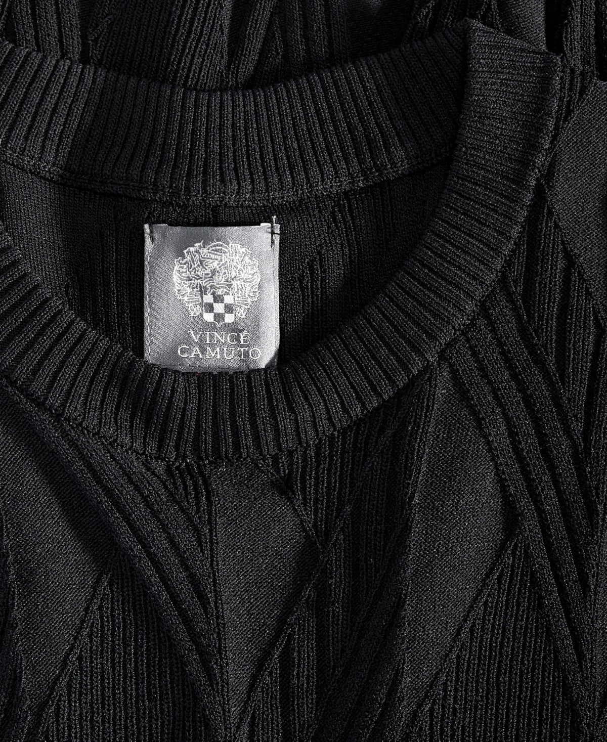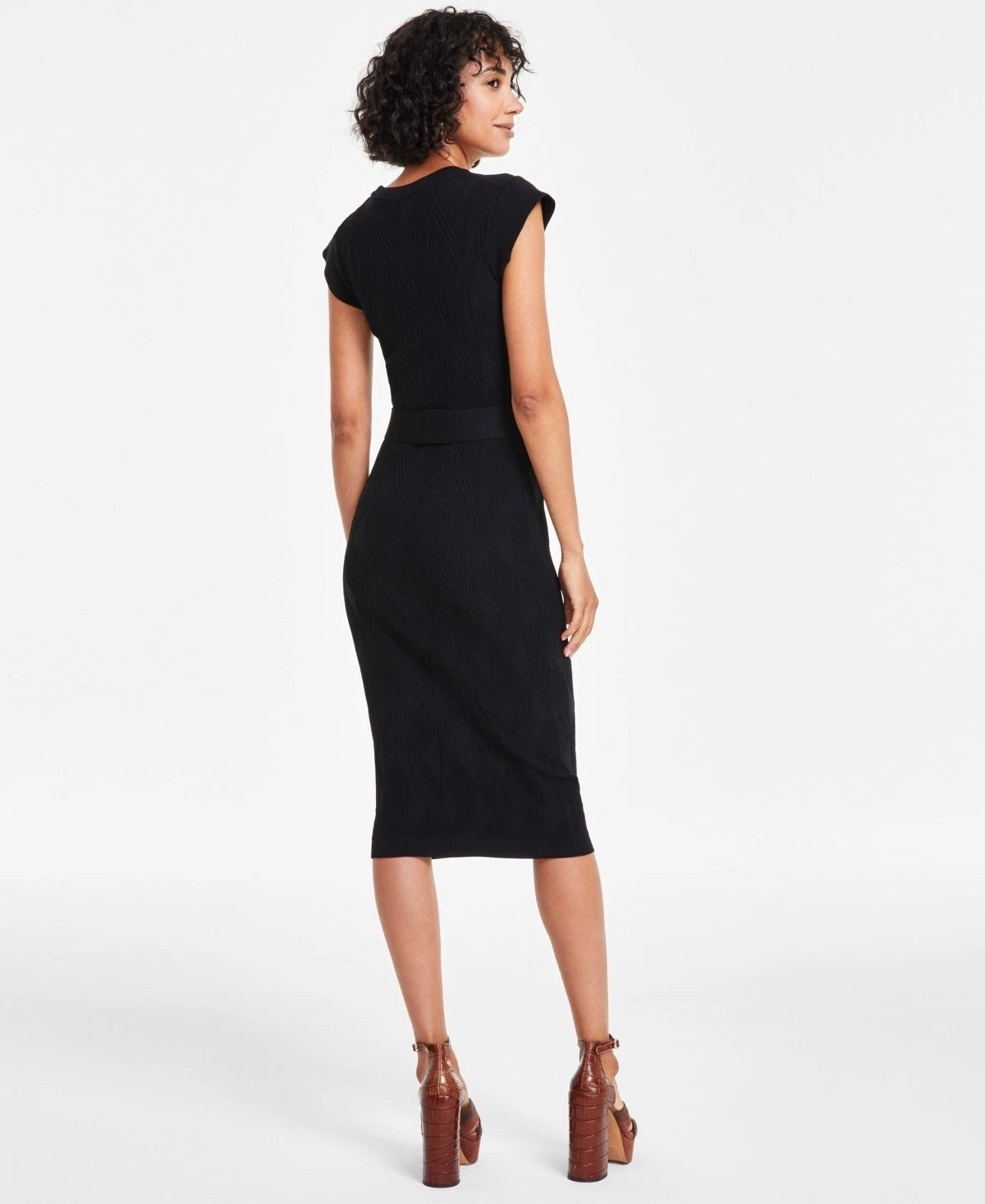 A textured knit lends a sleek finish to this form-fitting midi dress by Vince Camuto, cinched at the waist with an adjustable belt.