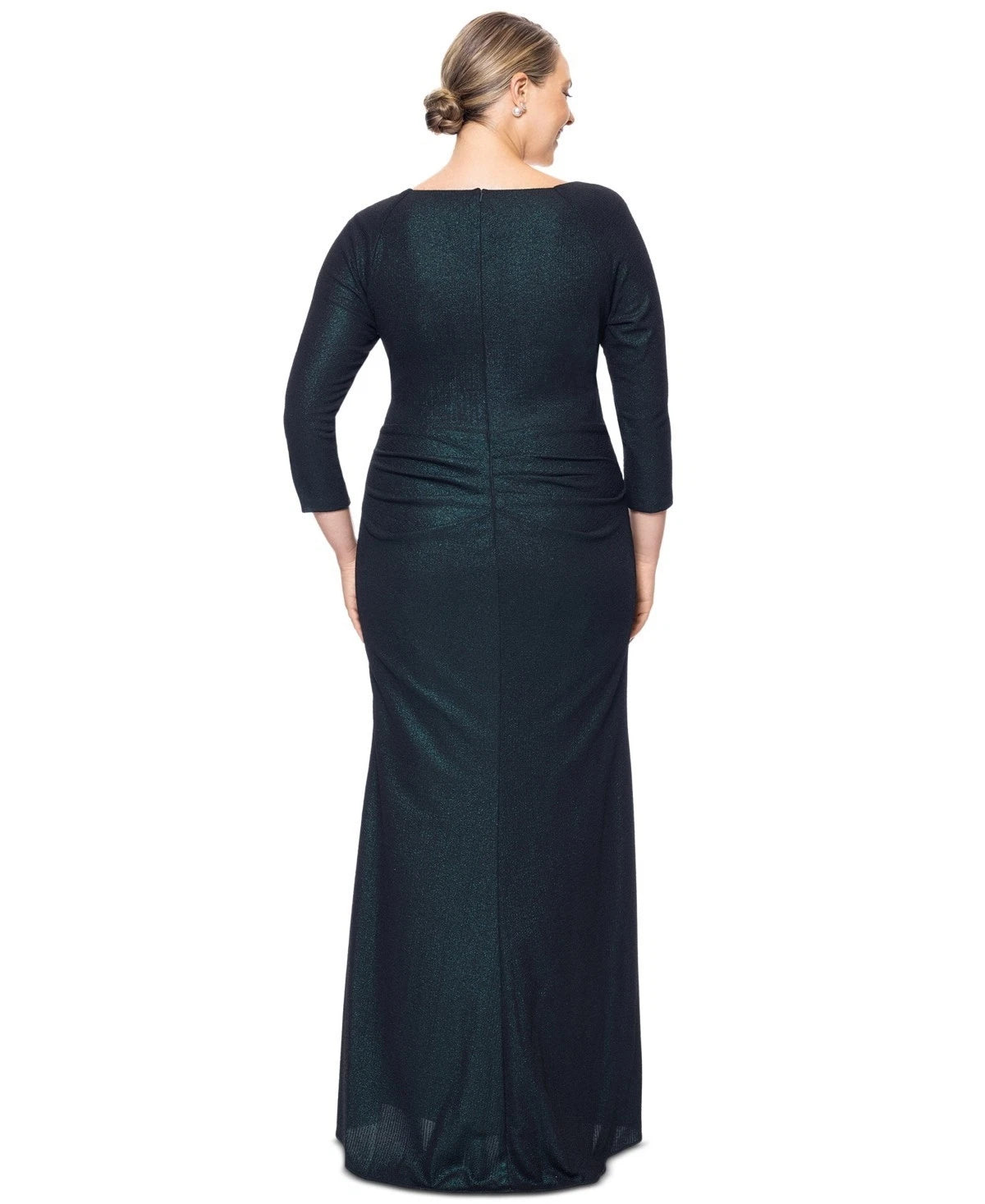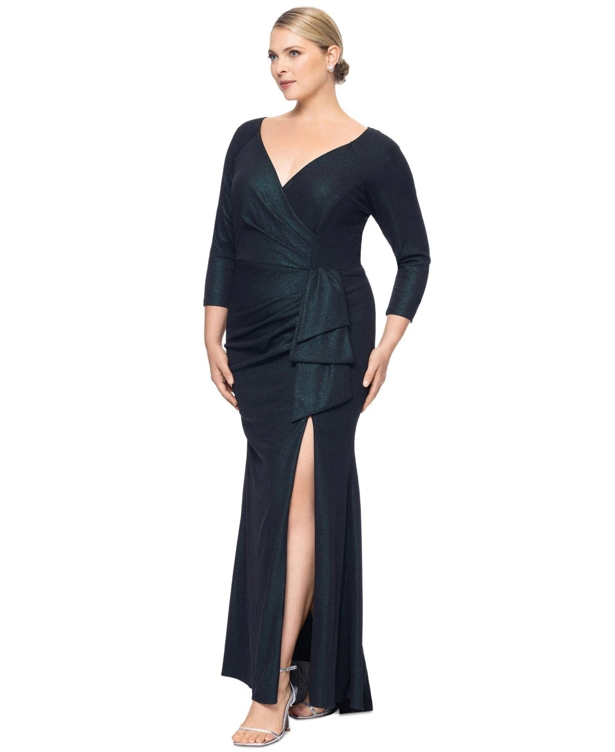 Gathered and draped in all the right places, this plus size dress from XSCAPE has metallic sheen for that special-event feel.