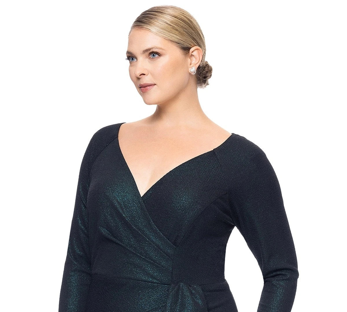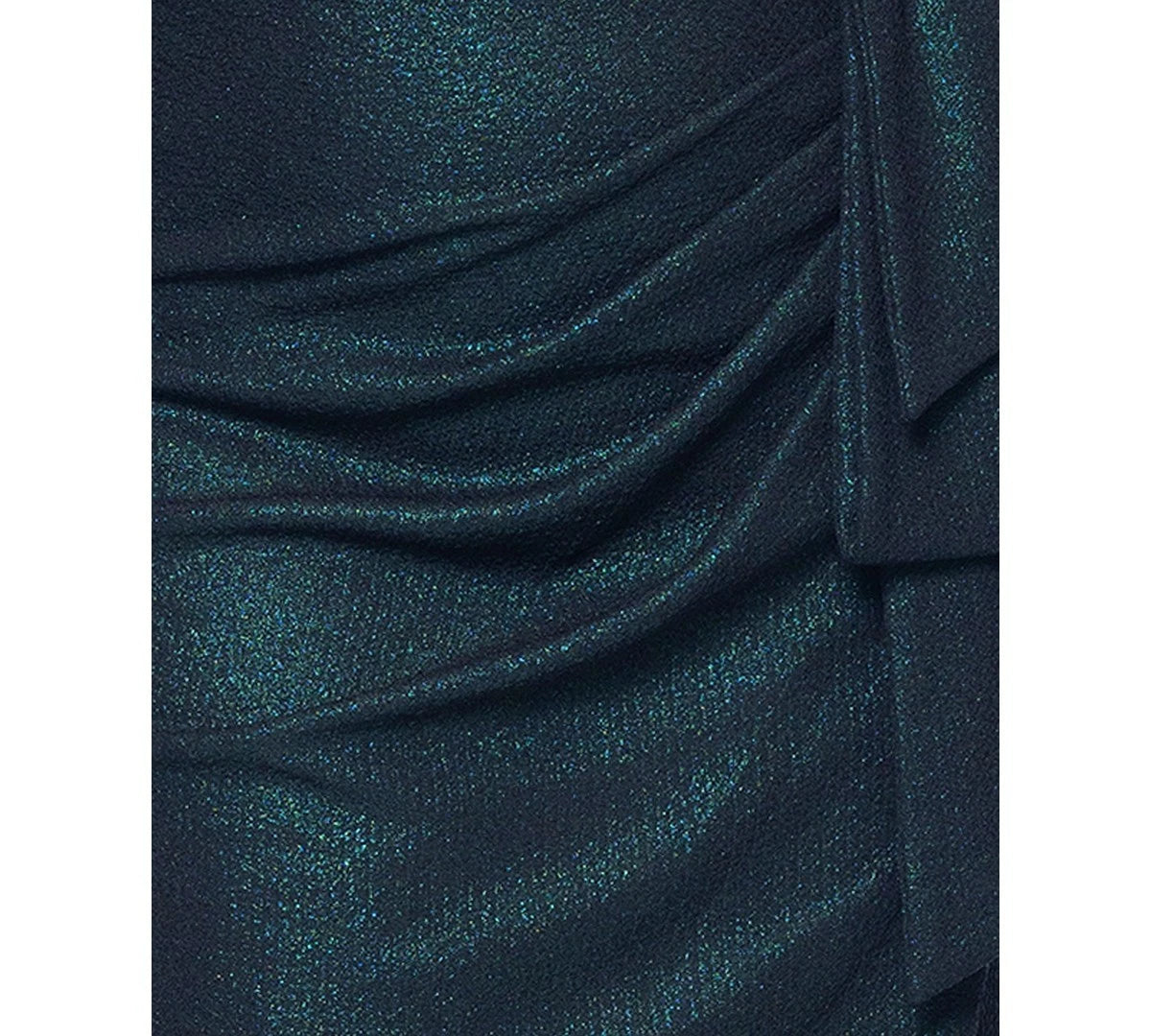 ** Surplice neck ** Sheath: Tailored fit through the chest, waist, and hips; sits close to the body ** Scuba: also known as neoprene; structured and supportive knit fabric ** Back zip closure ** Metallic threading throughout; gathered to one side of waist; cascading detail at hip; high slit ** Long sleeves ** Lined ** 97% polyester, 3% spandex; lining: 100% polyester ** Spot clean ** Imported